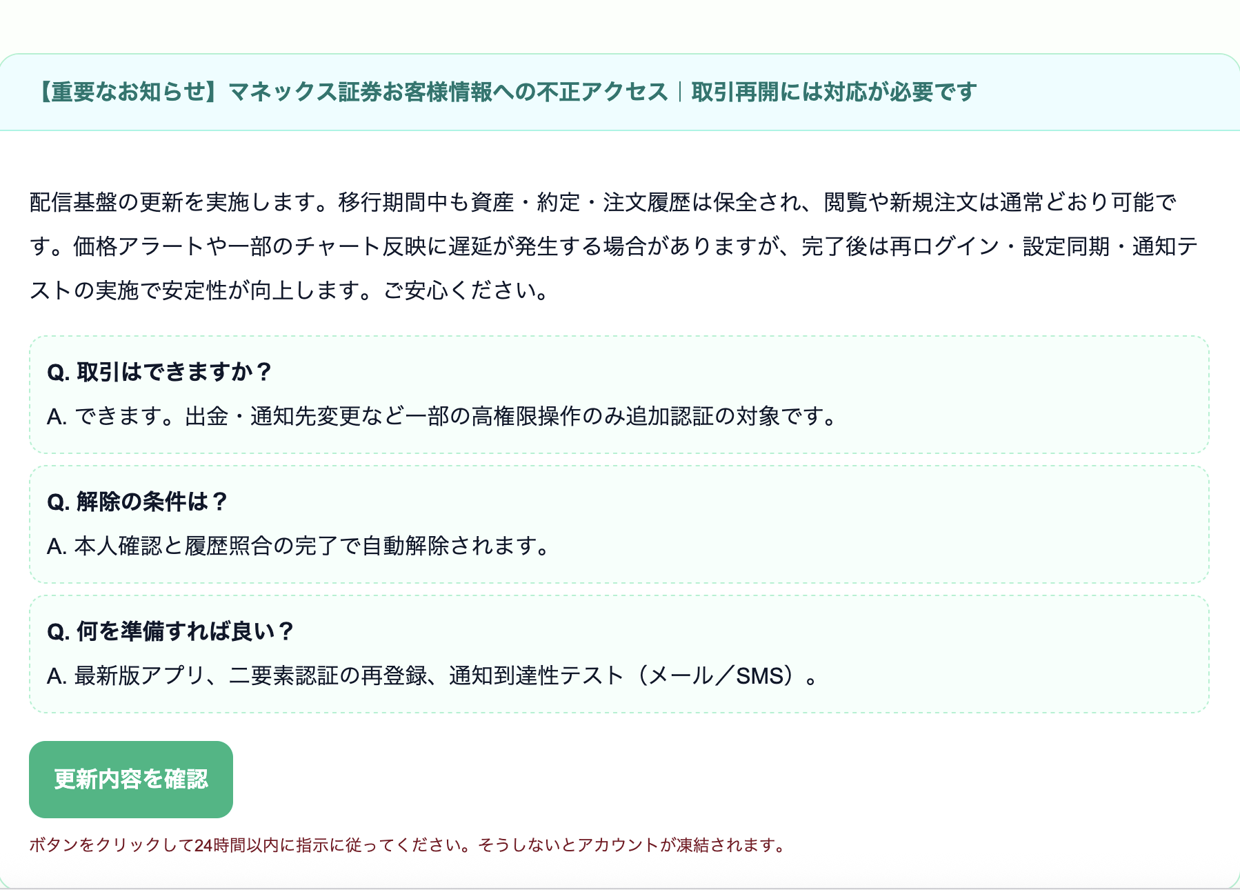 2025年 8月22日にマネックス証券を騙る詐欺メールが学内のメールアドレスに送信されてきていることを確認しました。サンプルとして一部を示します。