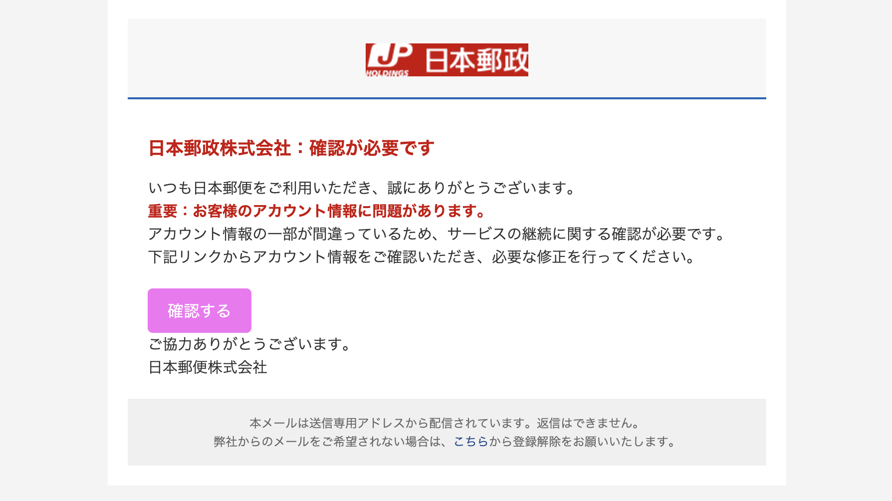 Subject: 【重要】日本郵政株式会社より確認のお願いIA=33143817113