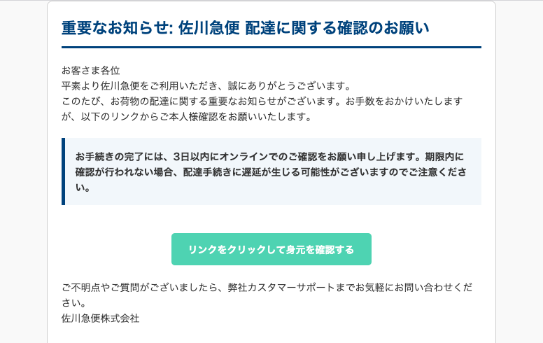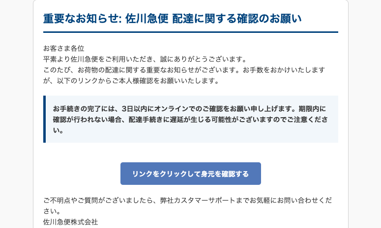 2025年 9月14日に佐川急便を騙る詐欺メールが学内のメールアドレスに送信されてきていることを確認しました。サンプルとして一部を示します。