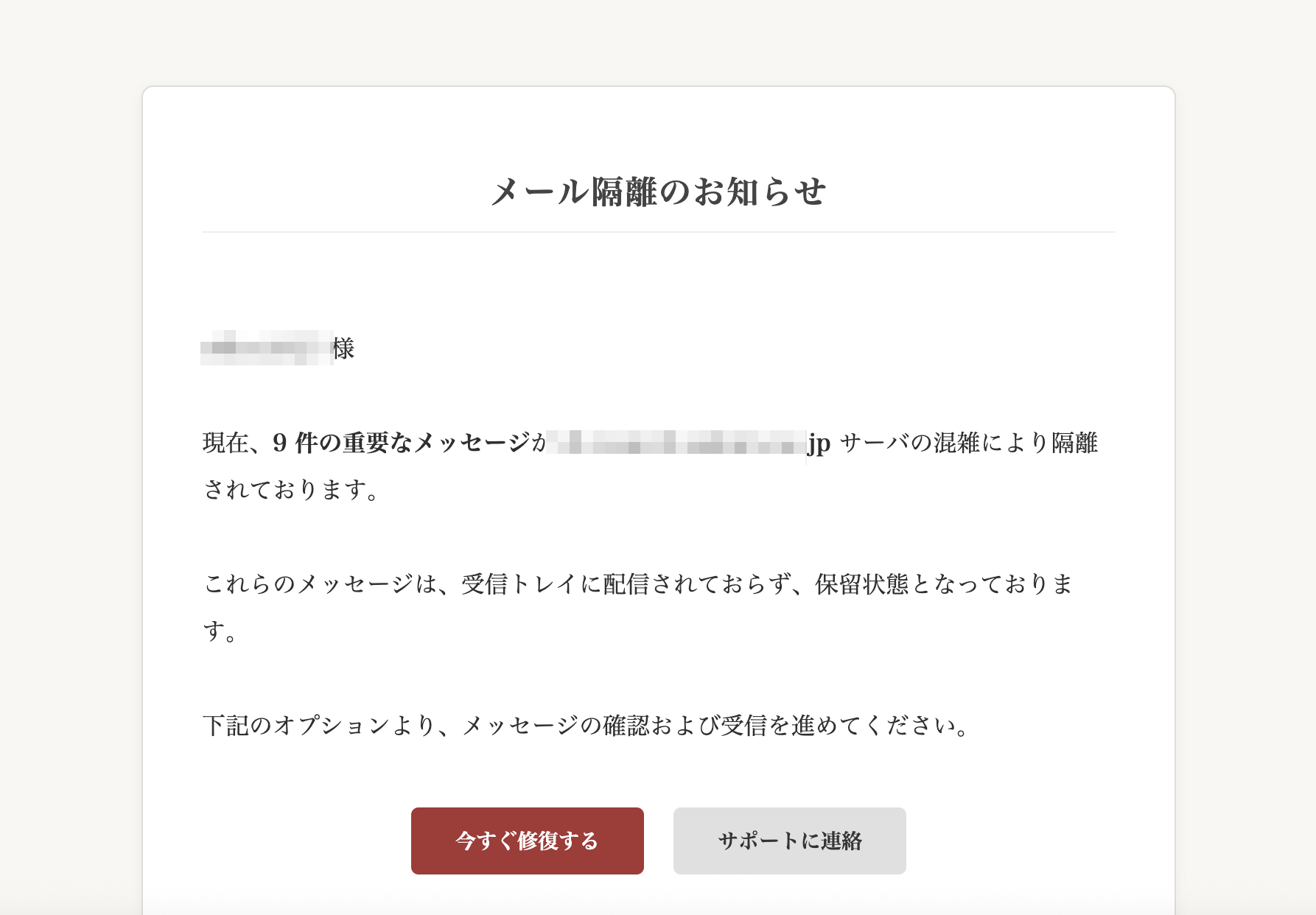 Subject: ⚠【通知】◯◯.◯◯◯◯.jp サーバー混雑により 9 件の重要なメールが隔離されました