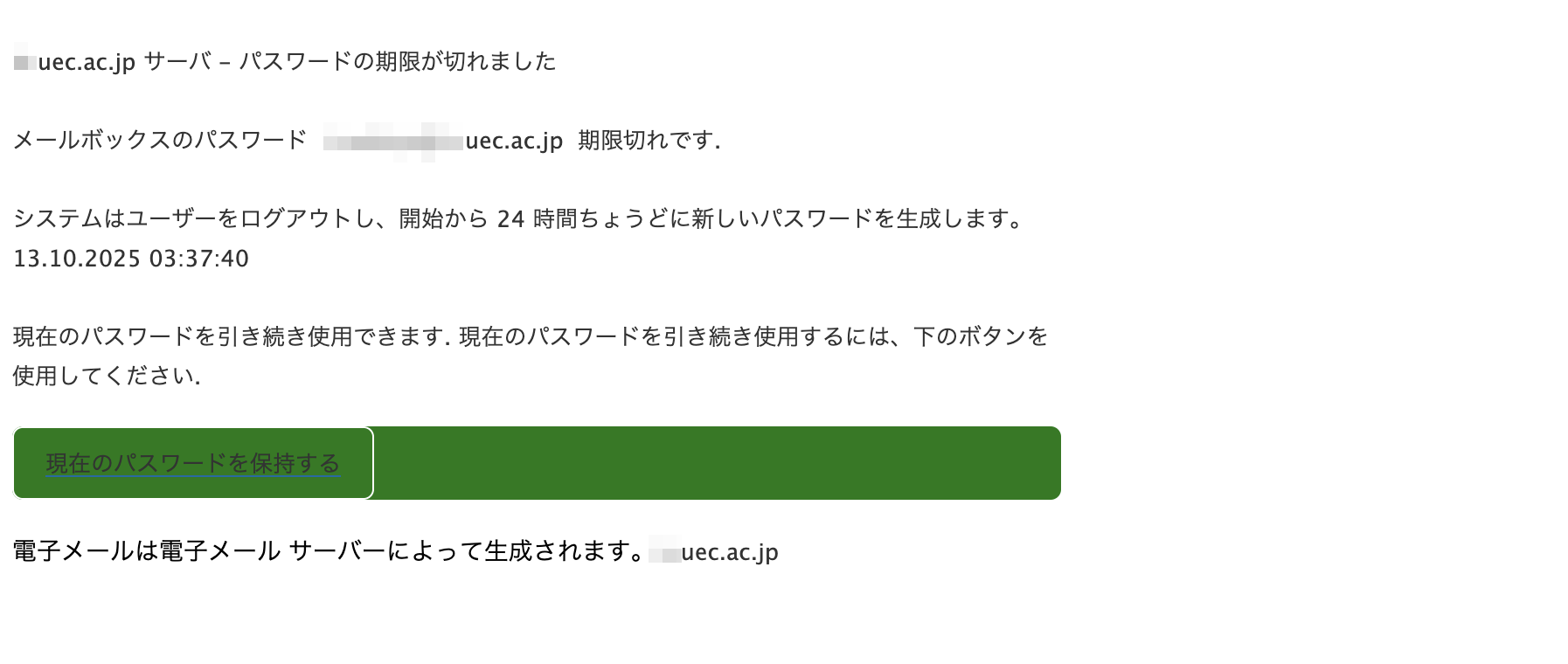 2025年10月13日にメールIDとパスワードを窃取する詐欺メールが学内のメールアドレスに送信されてきていることを確認しました。サンプルとして一部を示します。