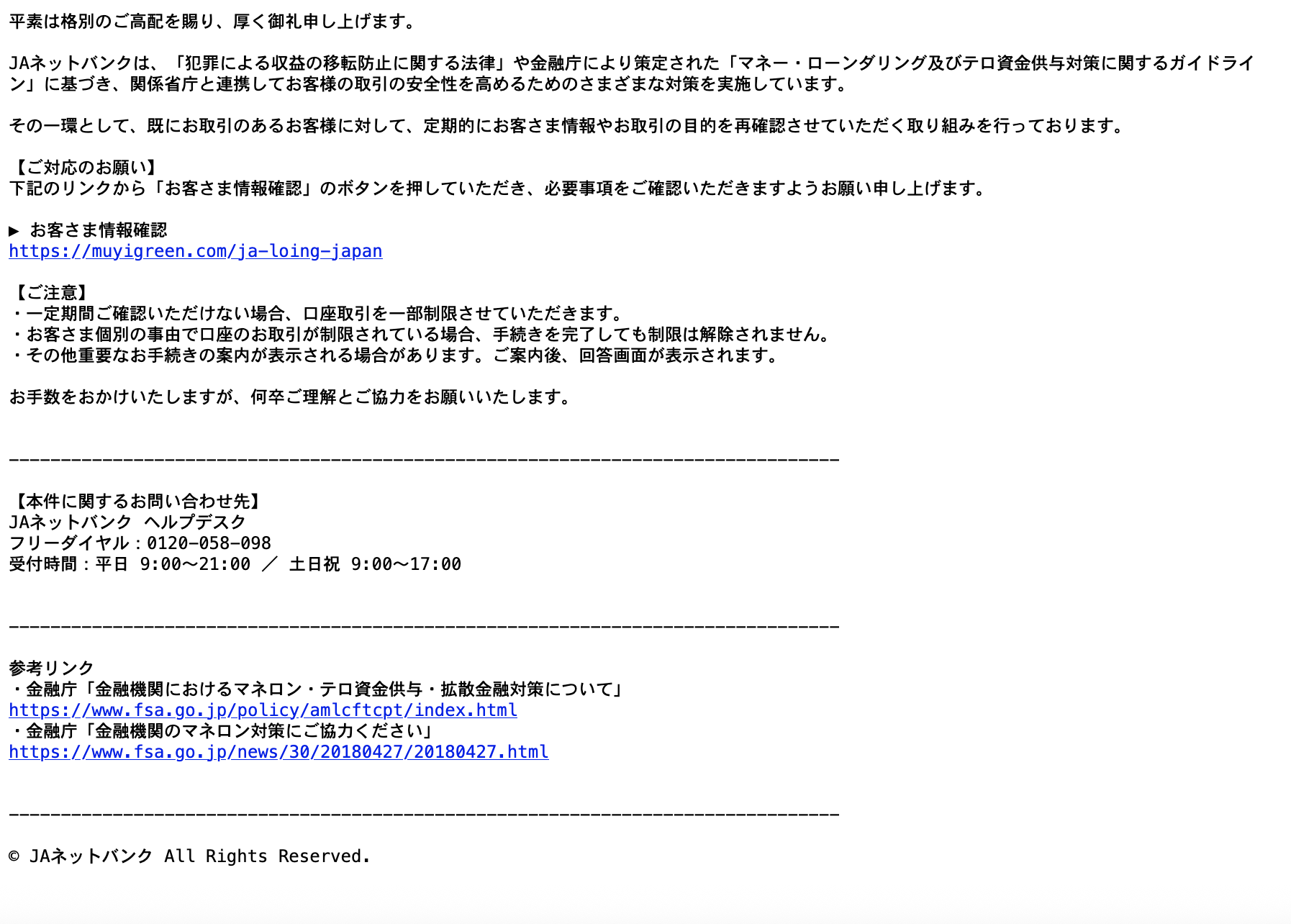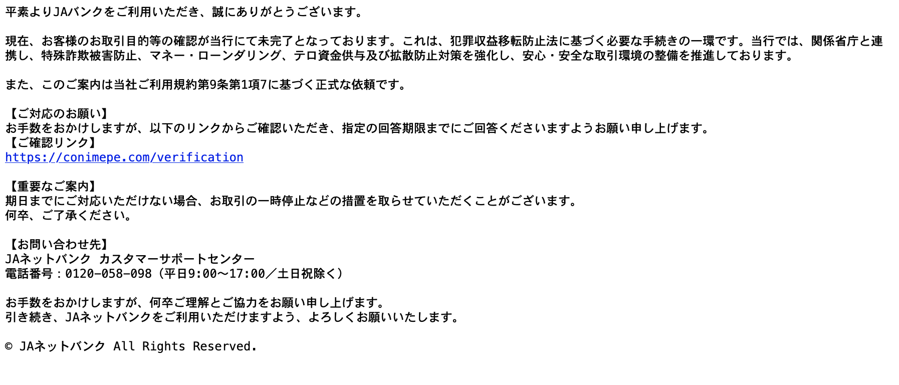 2025年10月 3日にJAバンクを騙る詐欺メールが学内のメールアドレスに送信されてきていることを確認しました。サンプルとして一部を示します。