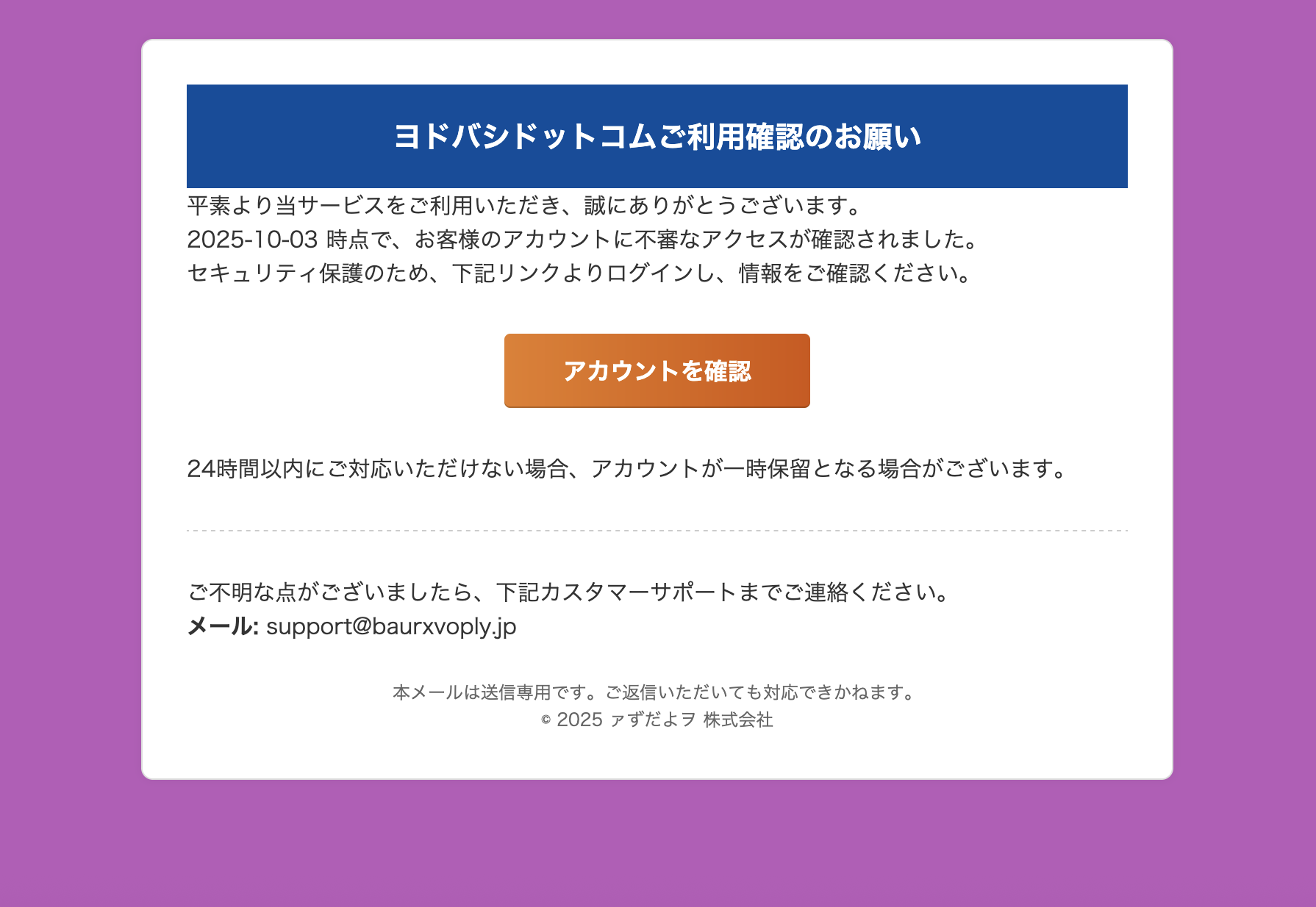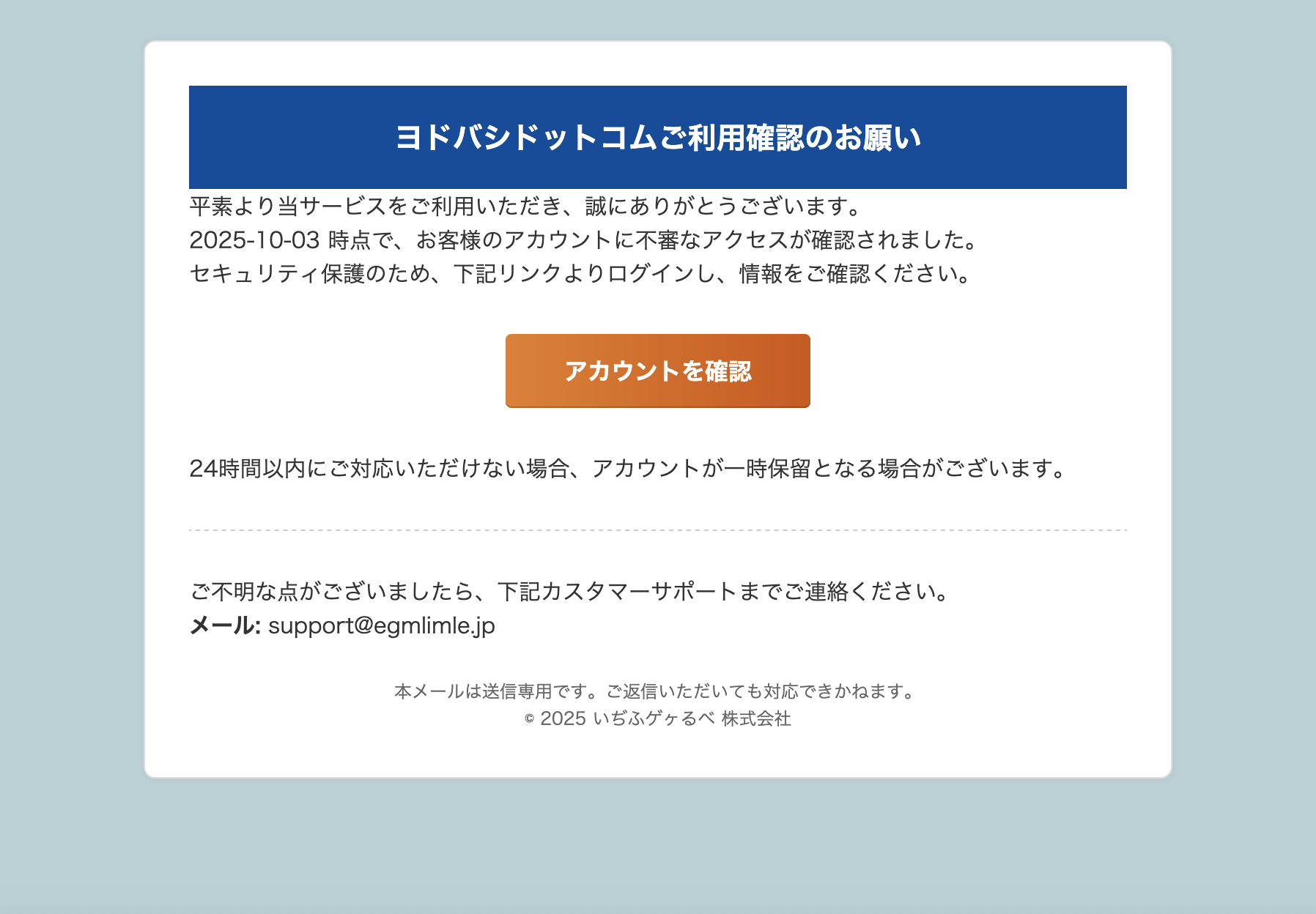 2025年10月 3日にヨドバシカメラを騙る詐欺メールが学内のメールアドレスに送信されてきていることを確認しました。サンプルとして一部を示します。