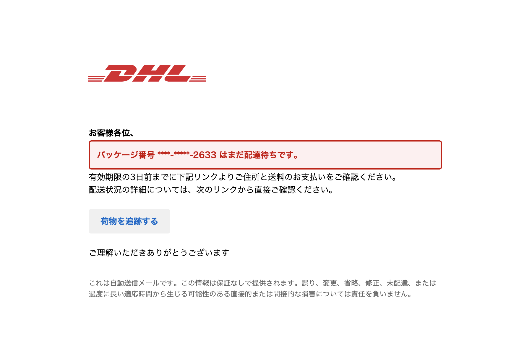 From: DHL EXPRESS <hachiyakazuaki-loop@faman.net>リンク先は詐欺サイトが動作しています。
