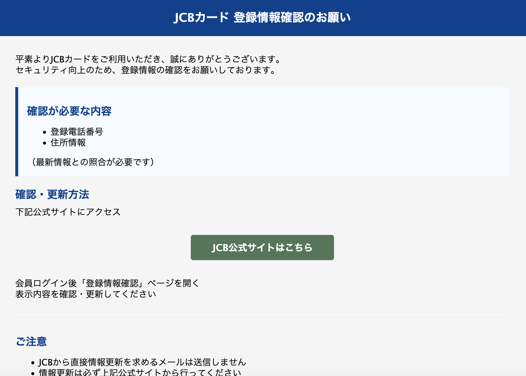 From: JCB <motohashi-kotaro@loell.com>リンク先は詐欺サイトが動作しています。