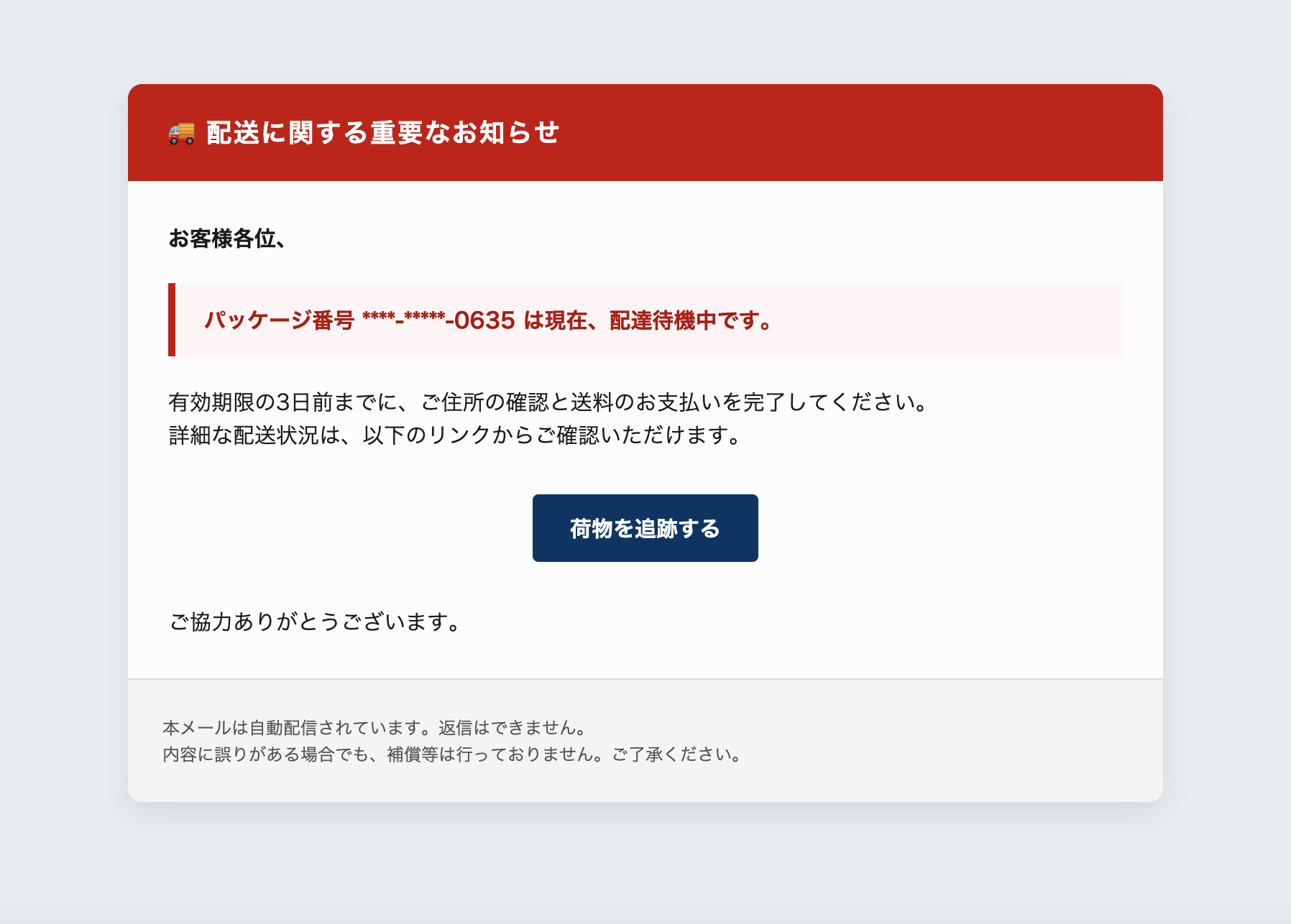 2025年10月15日にDHLを騙る詐欺メールが学内のメールアドレスに送信されてきていることを確認しました。サンプルとして一部を示します。