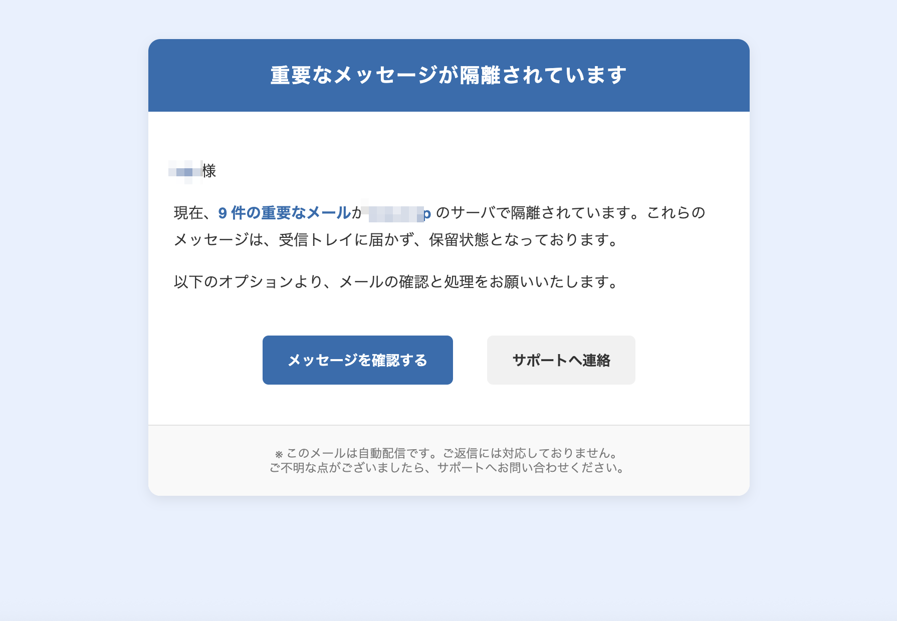 Subject: 重要:◯◯◯◯.◯◯.jpサーバ上に隔離されたメールがあります(全9件)