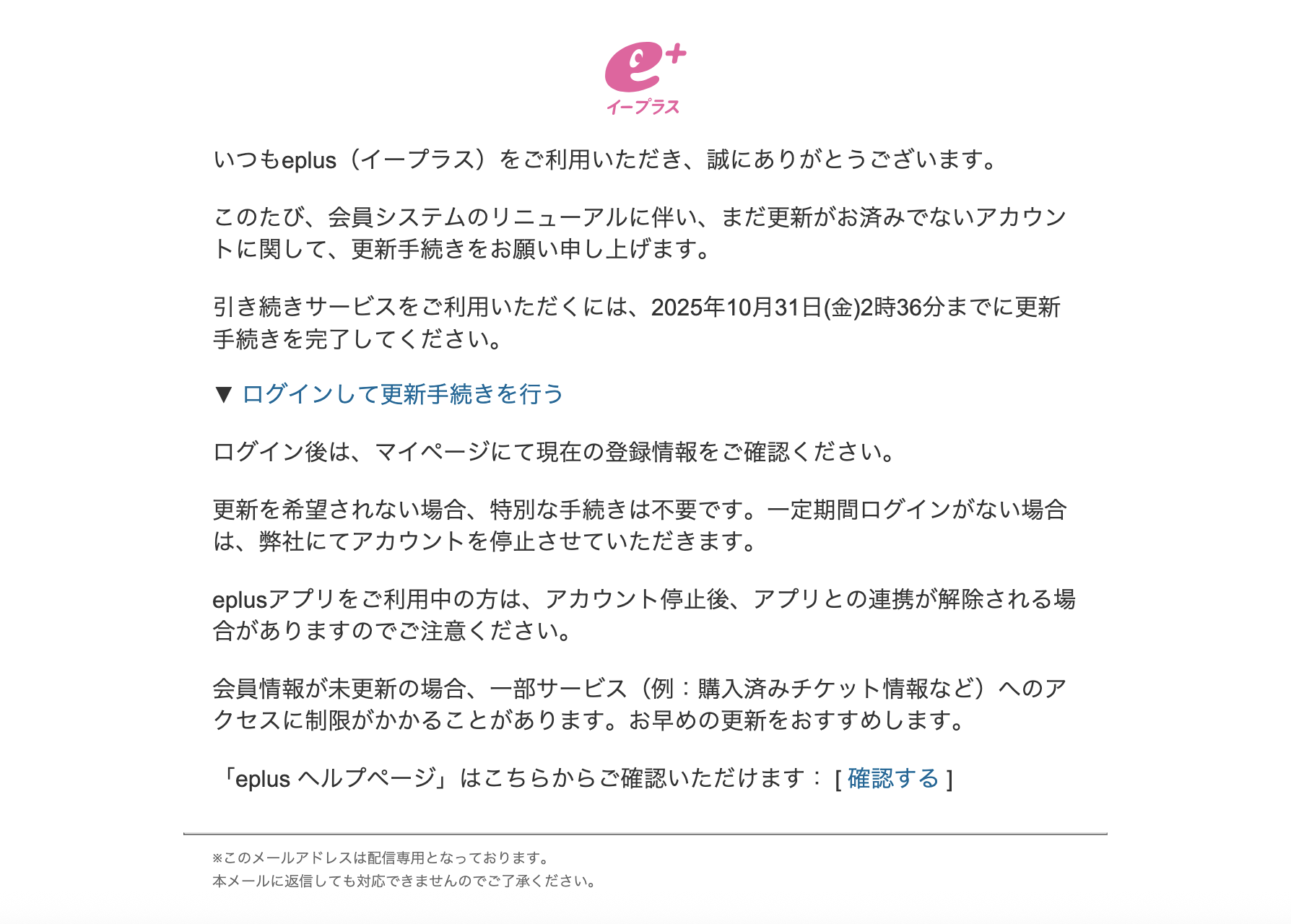 Subject: 【e+より】サービス継続には会員情報の更新が必要です