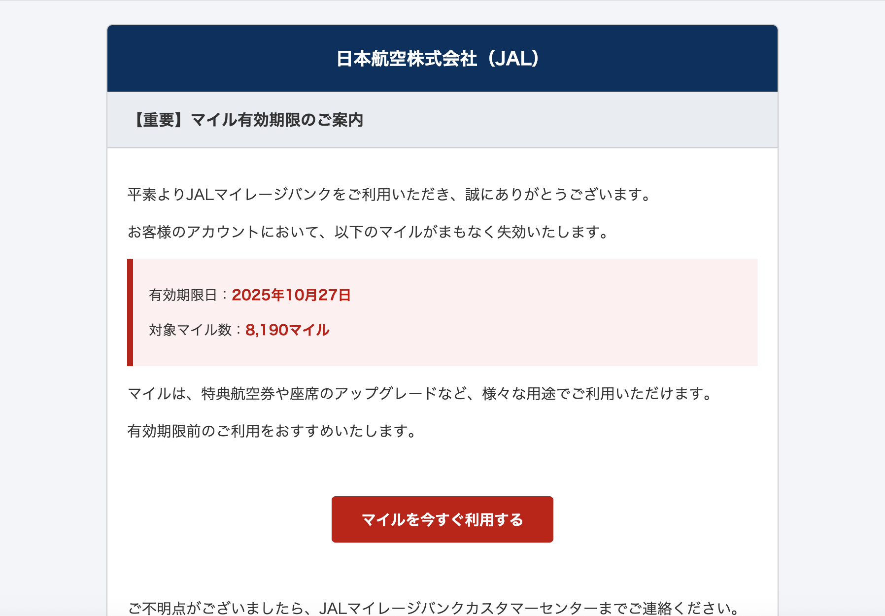 2025年10月27日にJALを騙る詐欺メールが学内のメールアドレスに送信されてきていることを確認しました。サンプルとして一部を示します。