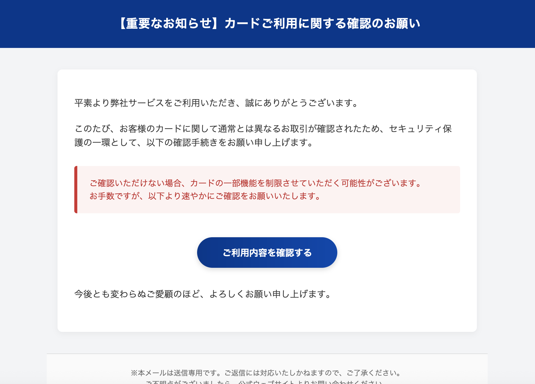 2025年10月27日にマスターカードを騙る詐欺メールが学内のメールアドレスに送信されてきていることを確認しました。サンプルとして一部を示します。