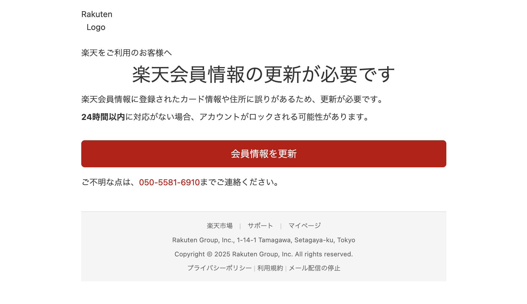 2025年10月27日に楽天を騙る詐欺メールが学内のメールアドレスに送信されてきていることを確認しました。サンプルとして一部を示します。