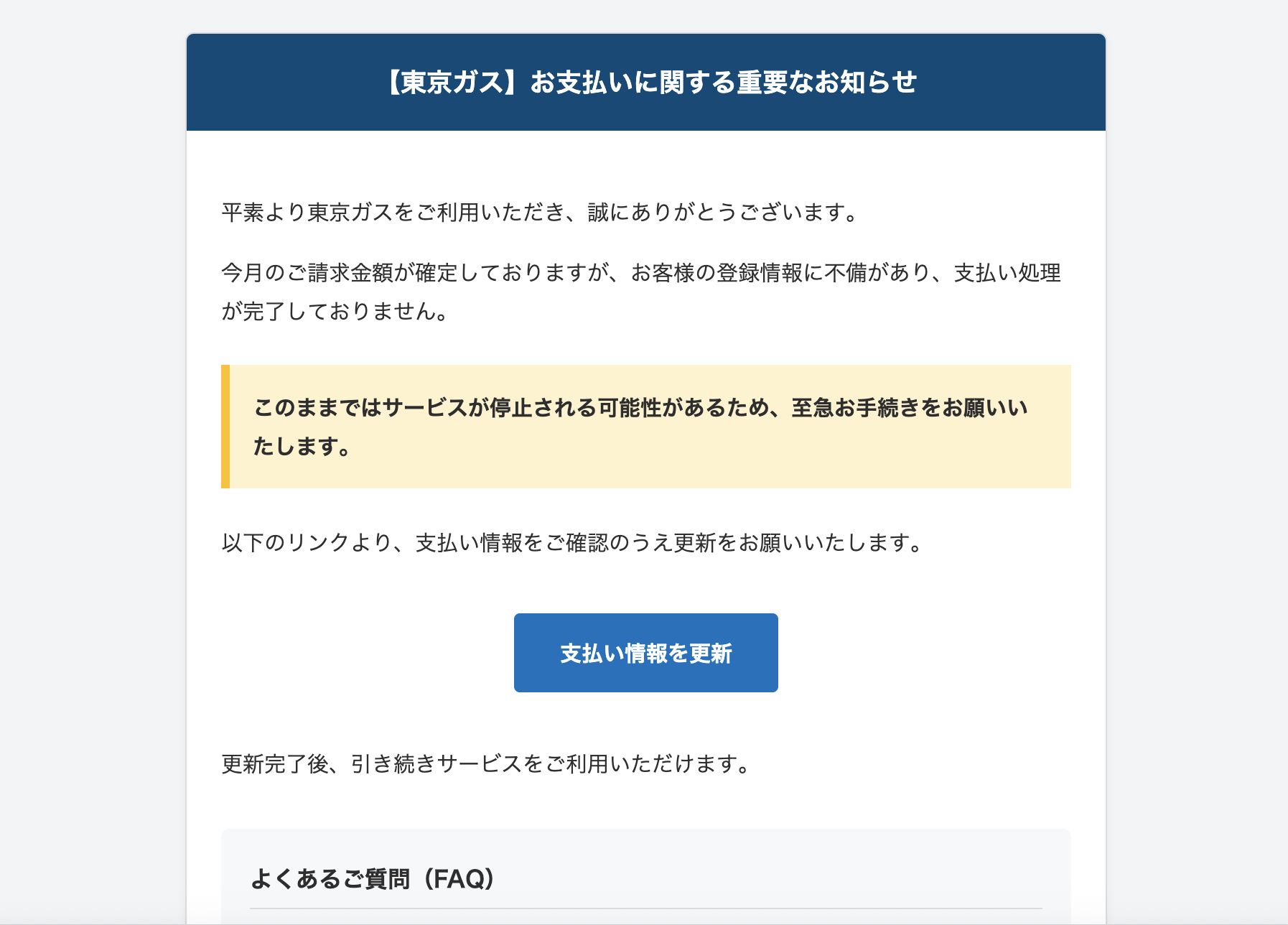 2025年10月27日に東京ガスを騙る詐欺メールが学内のメールアドレスに送信されてきていることを確認しました。サンプルとして一部を示します。