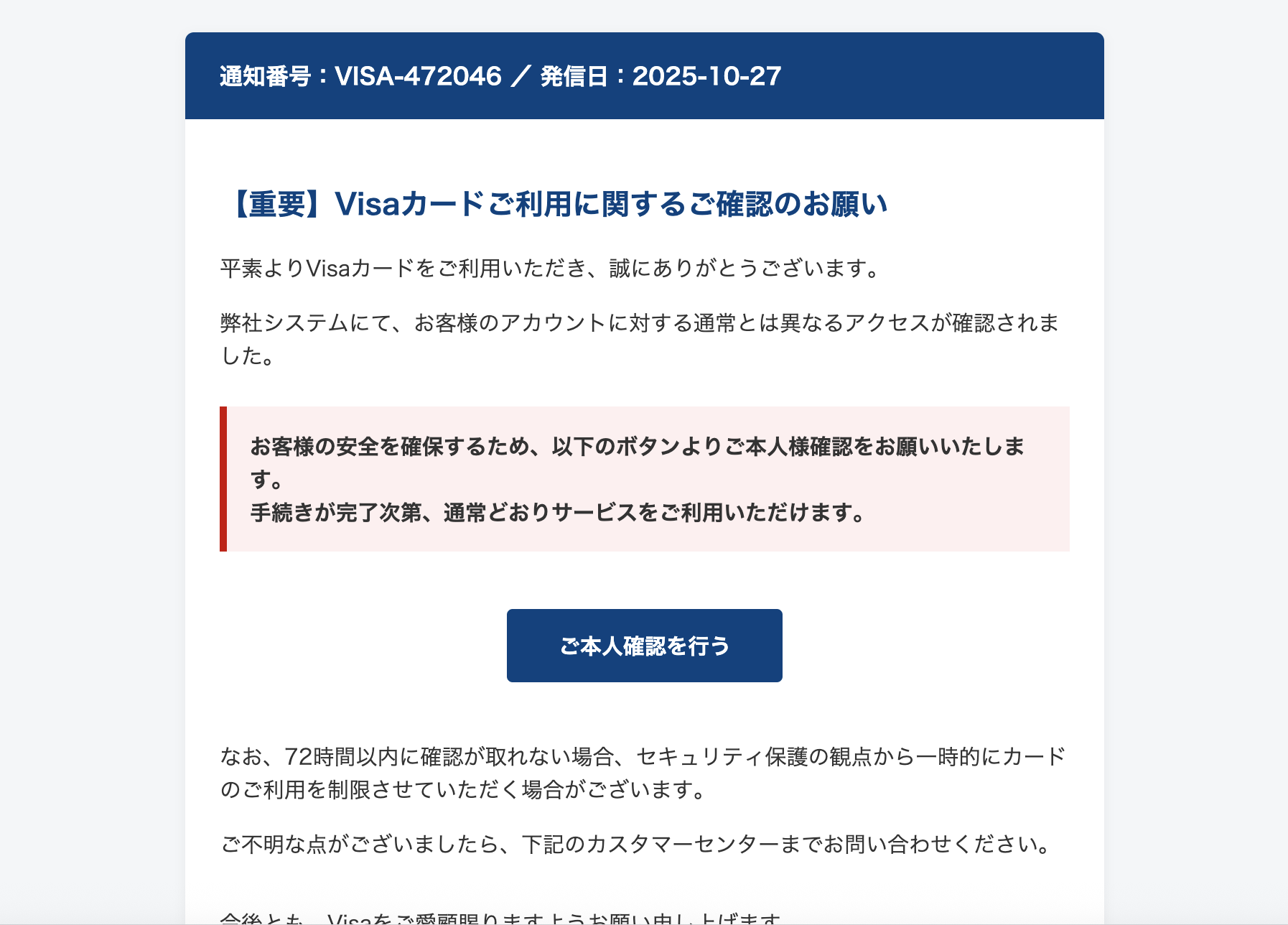 Subject: ご案内:visacardの利用確認手続きにご対応ください。