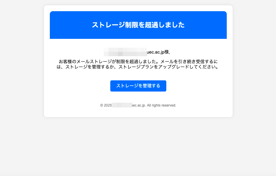 2025年11月 4日にメールIDとパスワードを窃取する詐欺メールが学内のメールアドレスに送信されてきていることを確認しました。サンプルとして一部を示します。