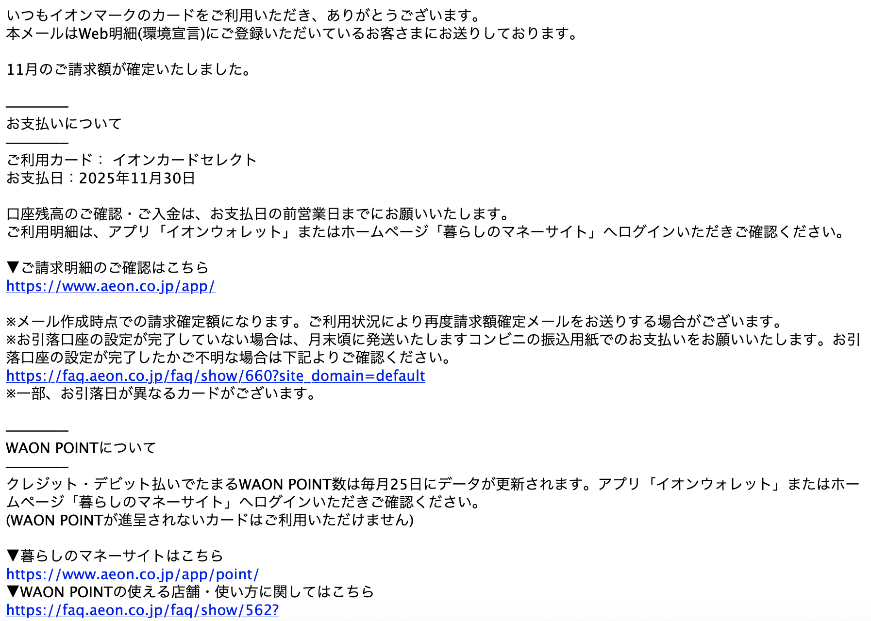 2025年11月 6日にイオンを騙る詐欺メールが学内のメールアドレスに送信されてきていることを確認しました。サンプルとして一部を示します。