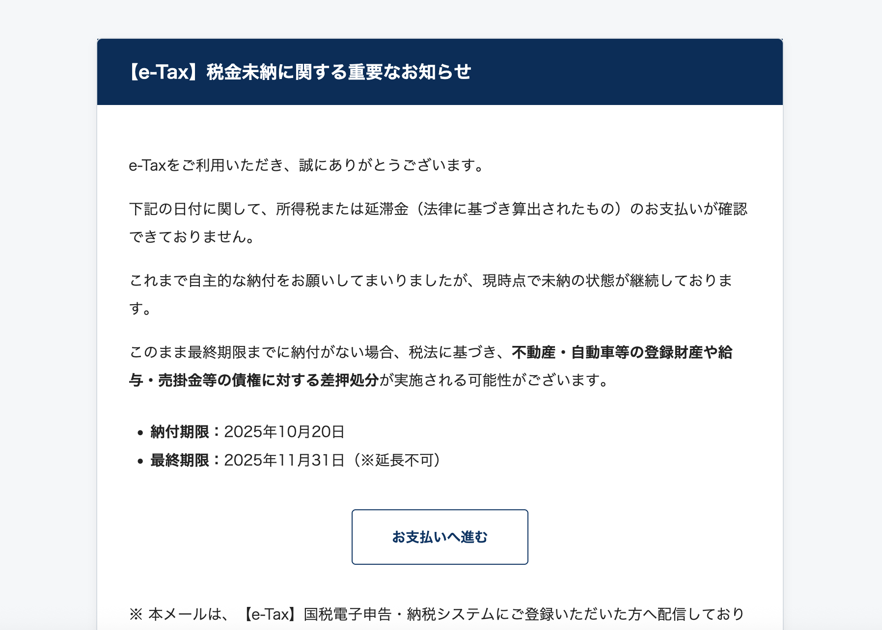 2025年11月 6日に国税庁を騙る詐欺メールが学内のメールアドレスに複数送信されてきていることを確認しました。サンプルとして本文の一部を示します。