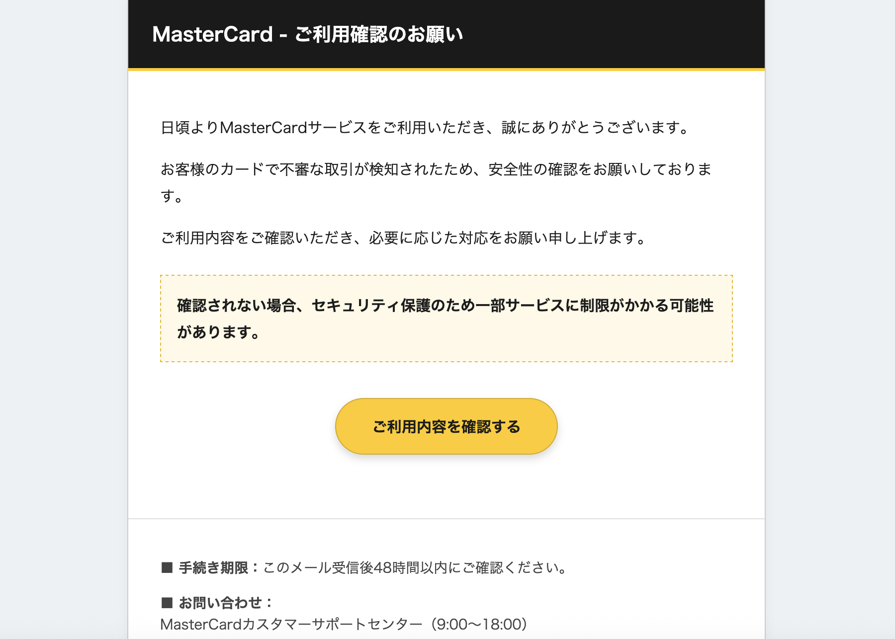 From: Mastercard <hana-amagasaki@moovc.com>リンク先は詐欺サイトが動作しています。