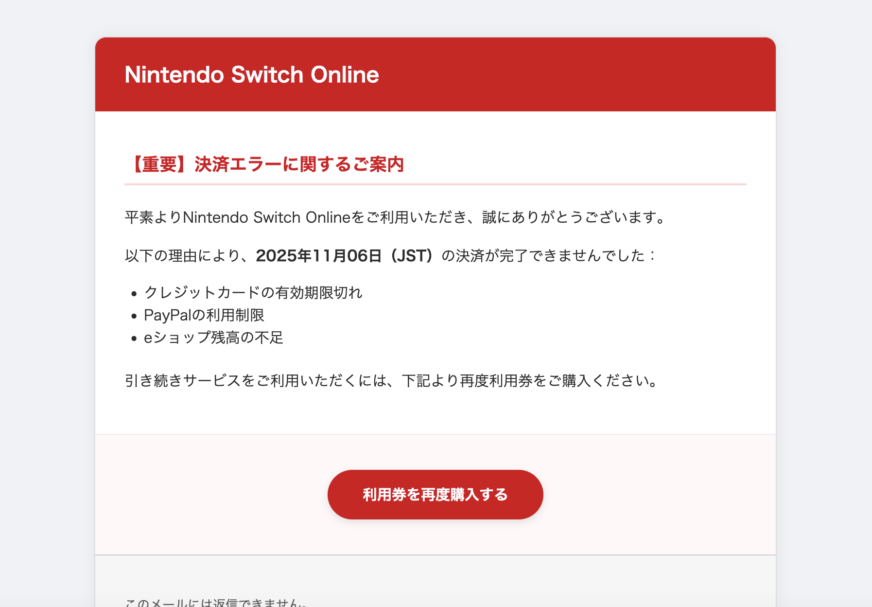 From: Nintendo Online <arisayamashita.narashino@ktocc.com>リンク先は複数あり、全て詐欺サイトが動作しています。