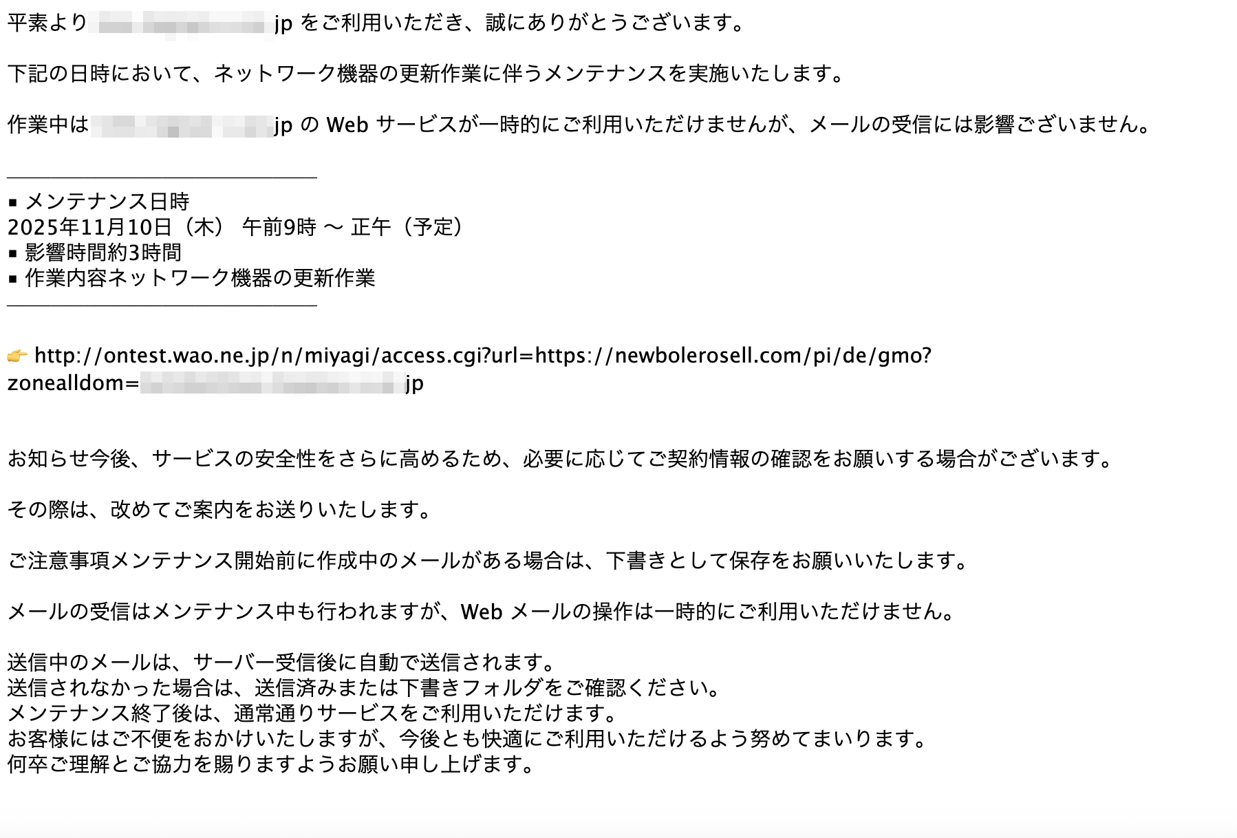Subject: お知らせ〇〇〇〇.〇〇〇〇.〇〇.jp メンテナンス実施のご案内(11月10日予定): - 11/10/2025 2:18:28 a.m. Contact - 〇〇〇〇@〇〇〇〇.〇〇〇〇.〇〇.jp