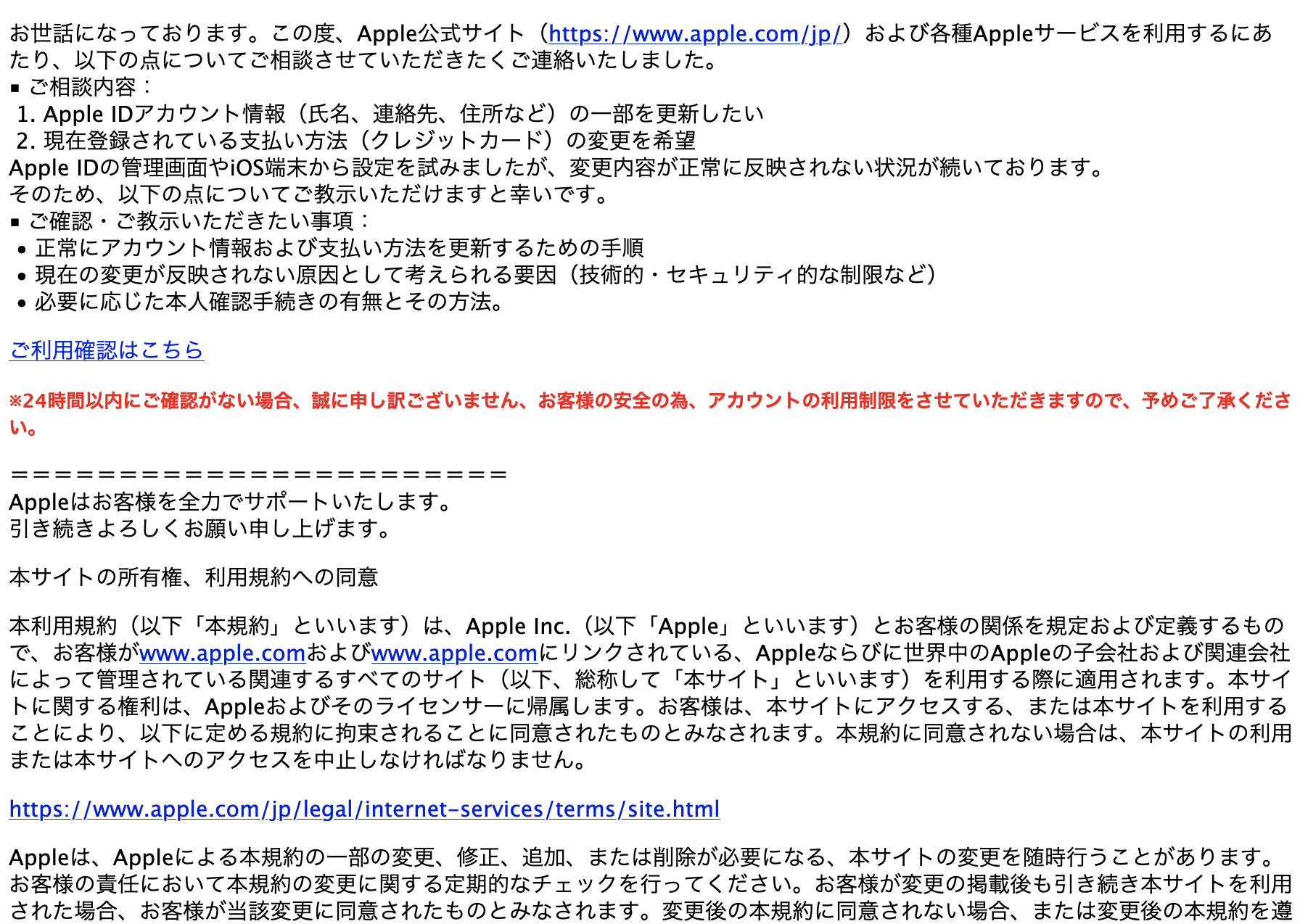 From: "Apple" <no_reply@email.apple.com>リンク先は詐欺サイトが動作しています。