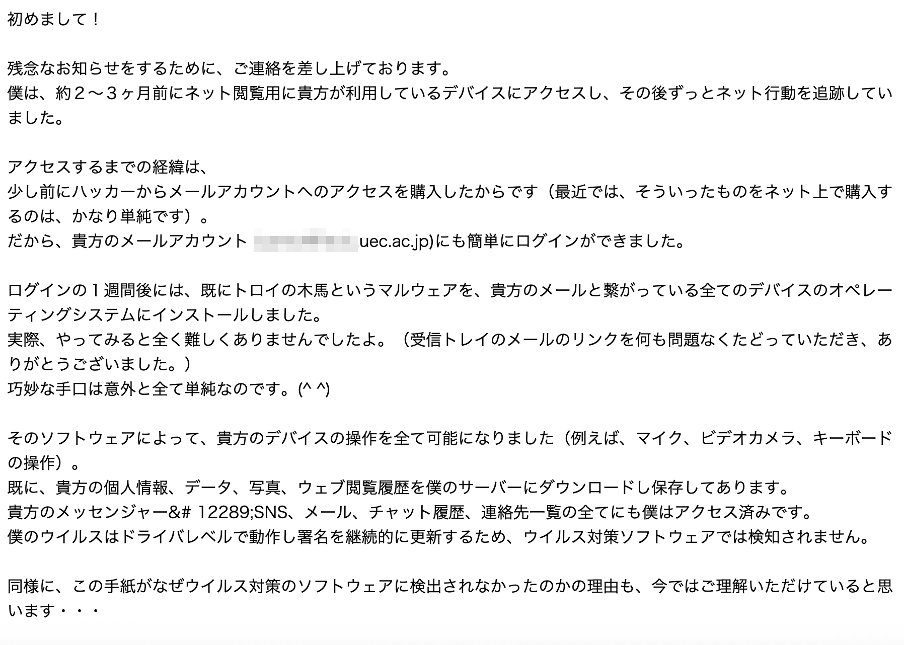 2025年11月17日にばらまき型脅迫詐欺メール(性的脅迫メール)が学内のメールアドレスに複数送信されてきていることを確認しました。サンプルとして本文の一部を示します。