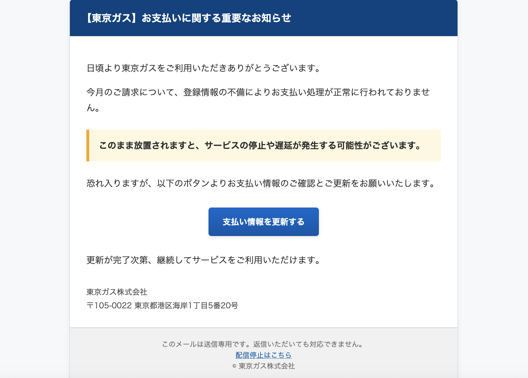 2025年11月17日に東京ガスを騙る詐欺メールが学内のメールアドレスに送信されてきていることを確認しました。サンプルとして一部を示します。