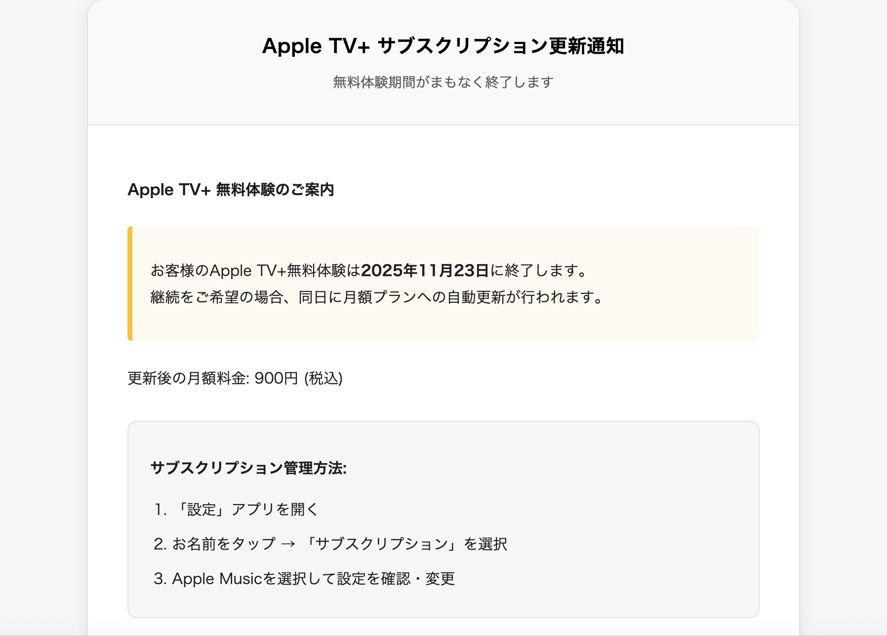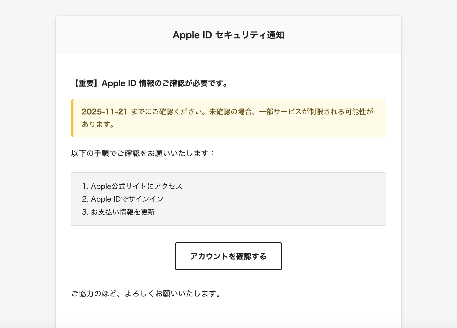2025年11月21日にAppleを騙る詐欺メールが学内のメールアドレスに送信されてきていることを確認しました。サンプルとして一部を示します。
