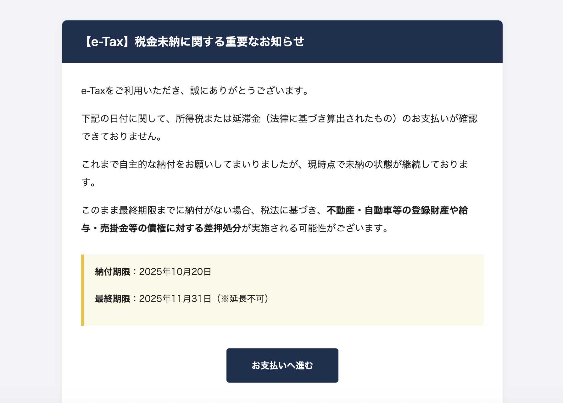 2025年11月21日に国税庁を騙る詐欺メールが学内のメールアドレスに複数送信されてきていることを確認しました。サンプルとして本文の一部を示します。