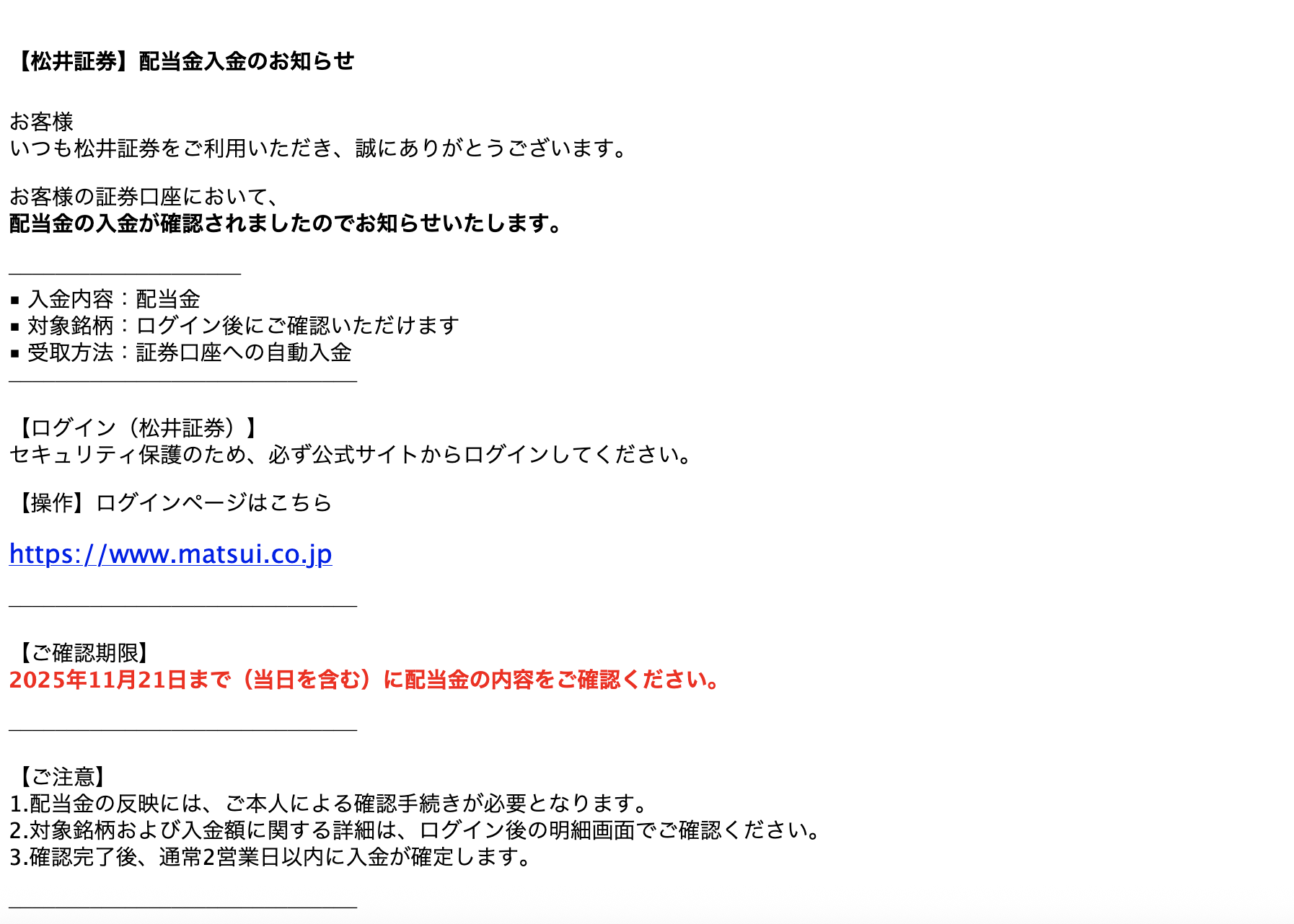 2025年11月21日に松井証券を騙る詐欺メールが学内のメールアドレスに送信されてきていることを確認しました。サンプルとして一部を示します。