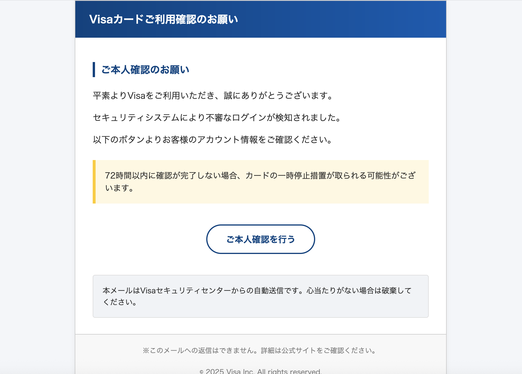 2025年11月21日にVISAを騙る詐欺メールが学内のメールアドレスに送信されてきていることを確認しました。サンプルとして一部を示します。
