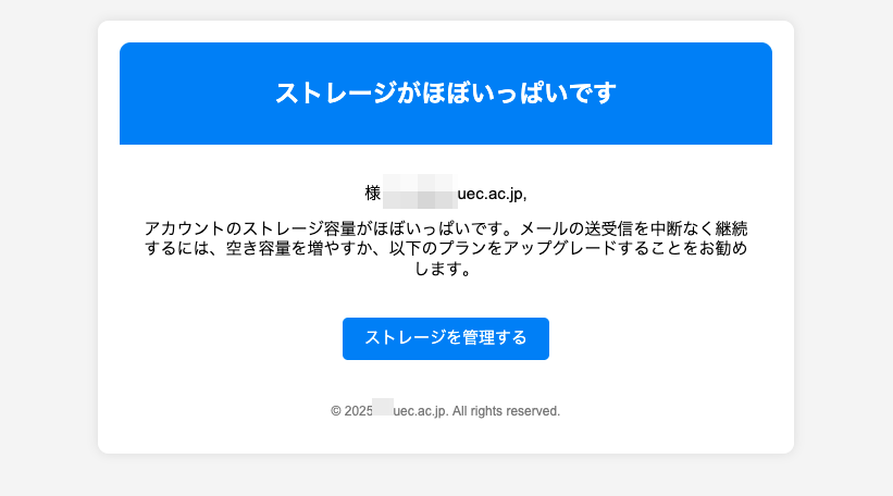2025年12月 4日にメールIDとパスワードを窃取する詐欺メールが学内のメールアドレスに送信されてきていることを確認しました。サンプルとして一部を示します。