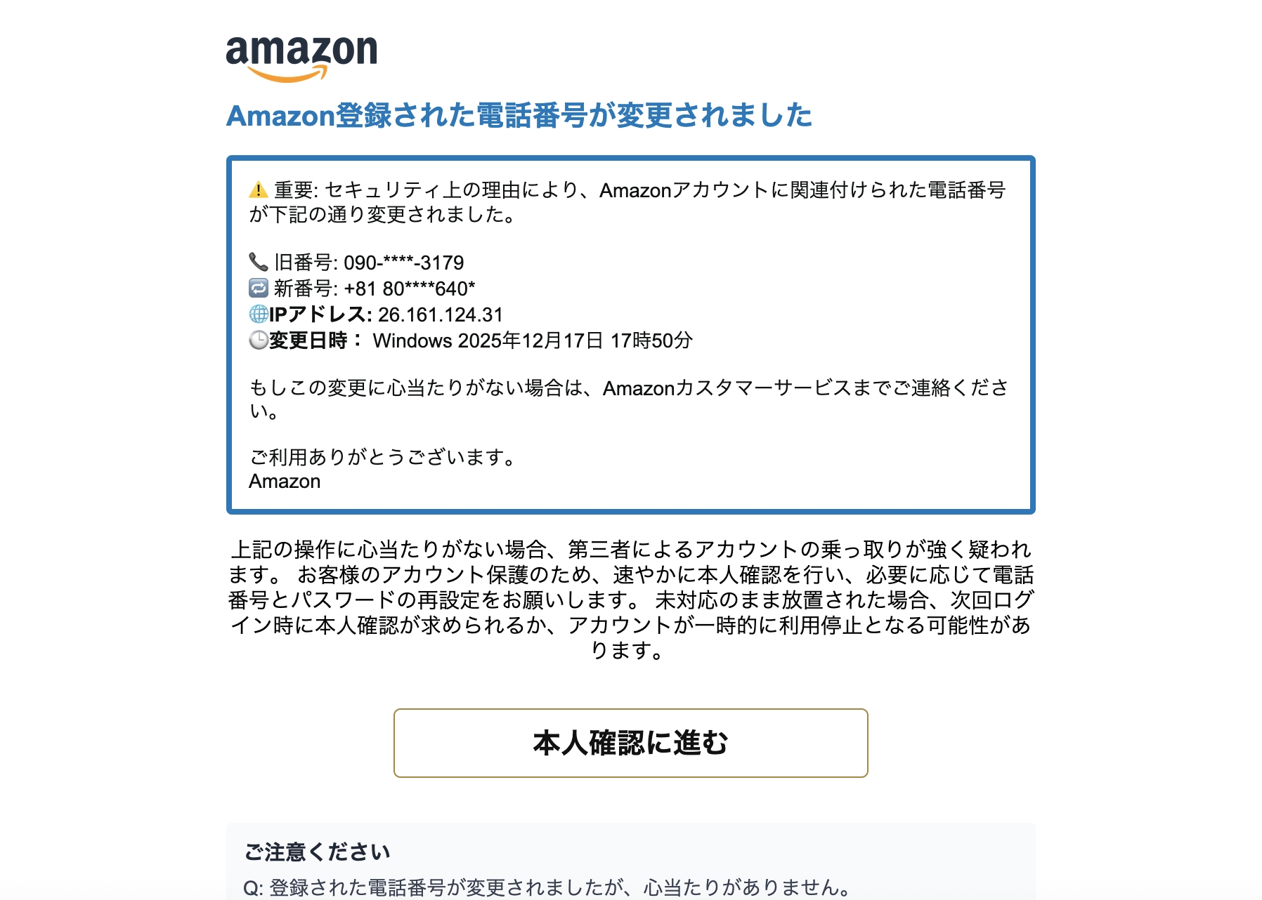 2025年12月19日にAmazonを騙る詐欺メールが学内のメールアドレスに送信されてきていることを確認しました。サンプルとして一部を示します。
