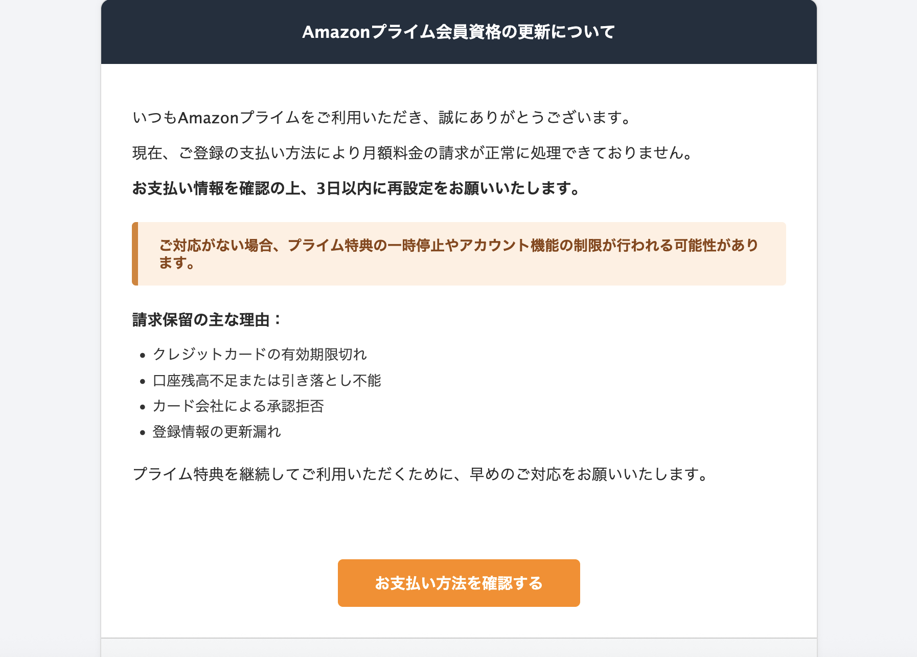 Subject: プライム会員資格の更新には支払い情報の確認が求められます。