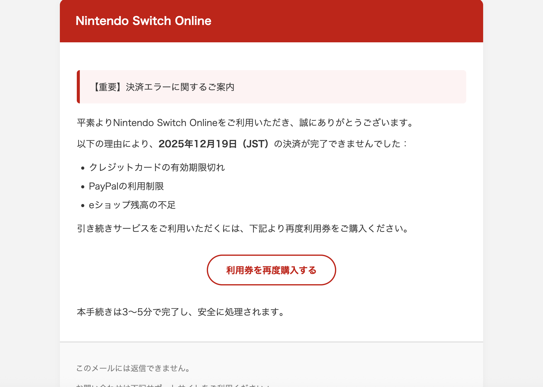 2025年12月19日に任天堂を騙る詐欺メールが学内のメールアドレスに複数送信されてきていることを確認しました。サンプルとして本文の一部を示します。