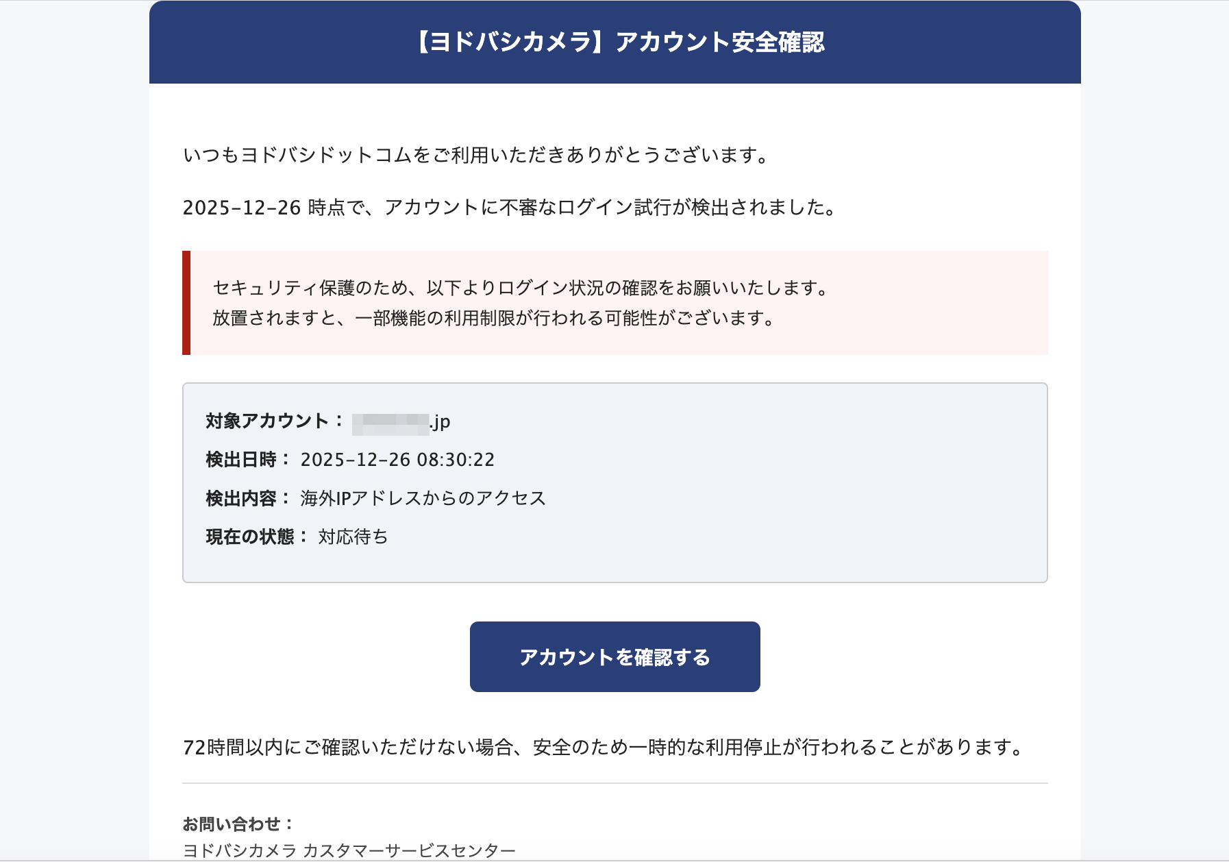 2025年12月26日にヨドバシカメラを騙る詐欺メールが学内のメールアドレスに送信されてきていることを確認しました。サンプルとして一部を示します。