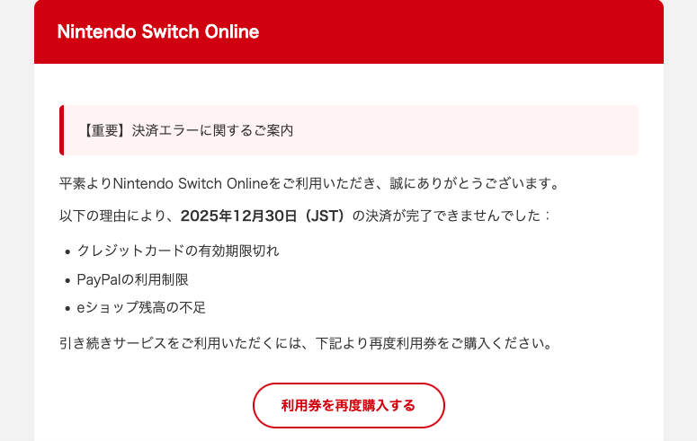 2025年12月30日に任天堂を騙る詐欺メールが学内のメールアドレスに複数送信されてきていることを確認しました。サンプルとして本文の一部を示します。