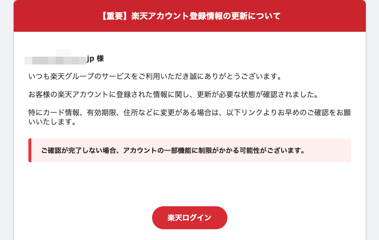 2025年12月30日に楽天を騙る詐欺メールが学内のメールアドレスに送信されてきていることを確認しました。サンプルとして一部を示します。