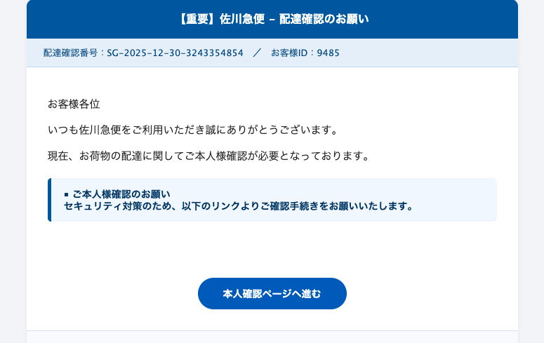 2025年12月30日に佐川急便を騙る詐欺メールが学内のメールアドレスに送信されてきていることを確認しました。サンプルとして一部を示します。