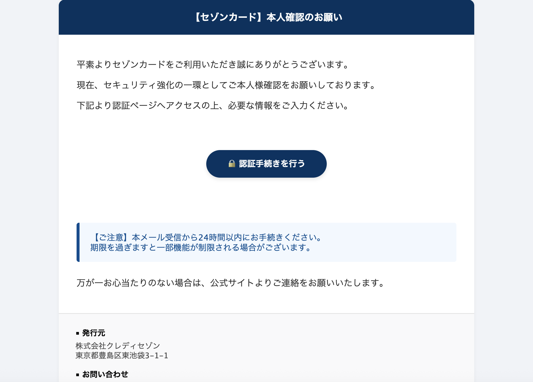 2026年 1月 5日にセゾンカードを騙る詐欺メールが学内のメールアドレスに送信されてきていることを確認しました。サンプルとして一部を示します。