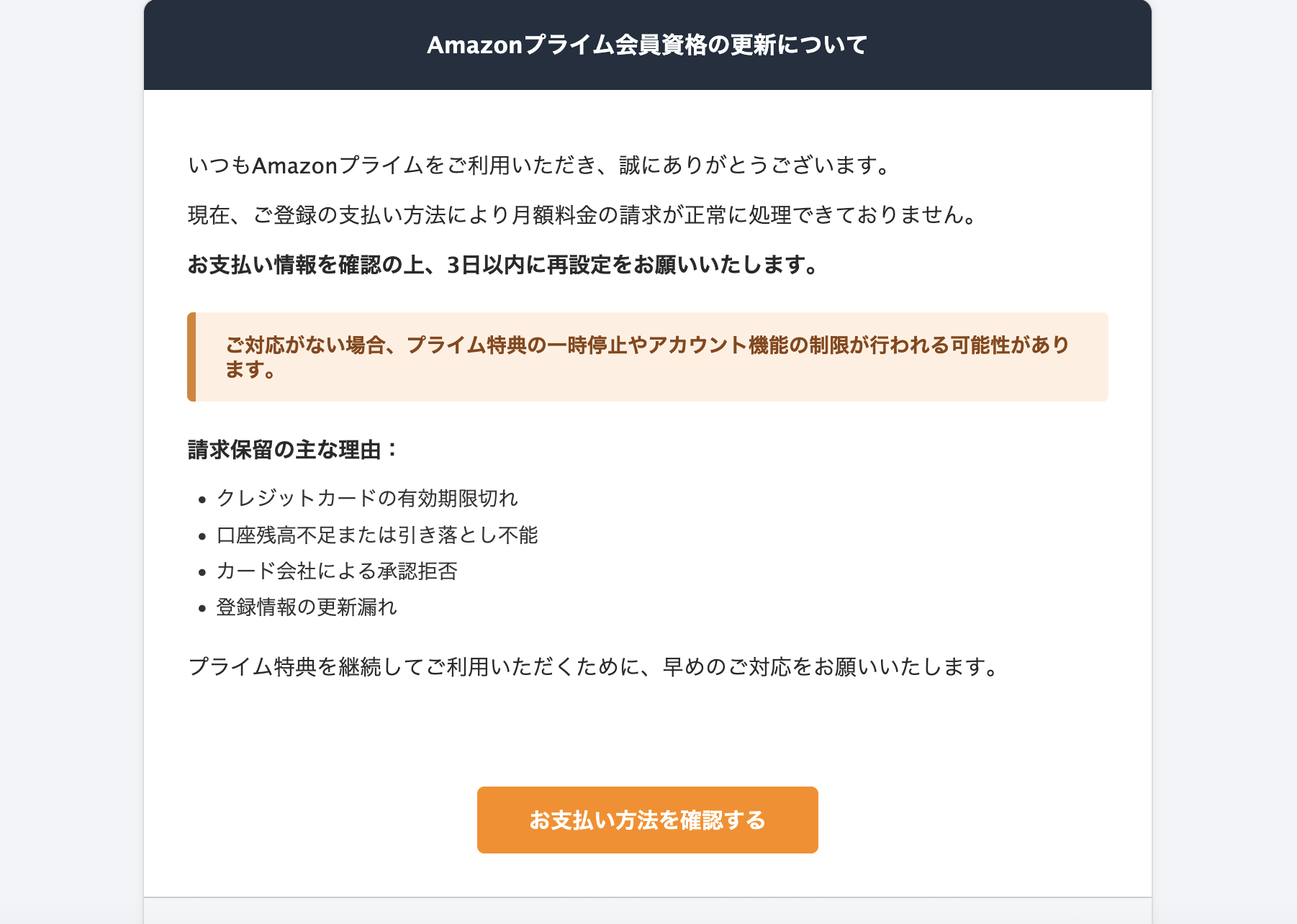 2026年 1月 7日にAmazonを騙る詐欺メールが学内のメールアドレスに送信されてきていることを確認しました。サンプルとして一部を示します。