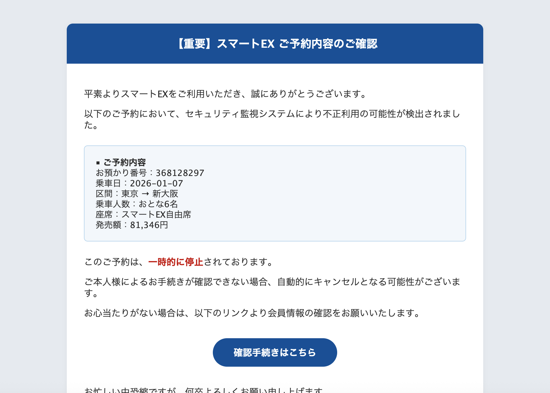 2026年 1月 7日にスマートEXを騙る詐欺メールが学内のメールアドレスに送信されてきていることを確認しました。サンプルとして一部を示します。