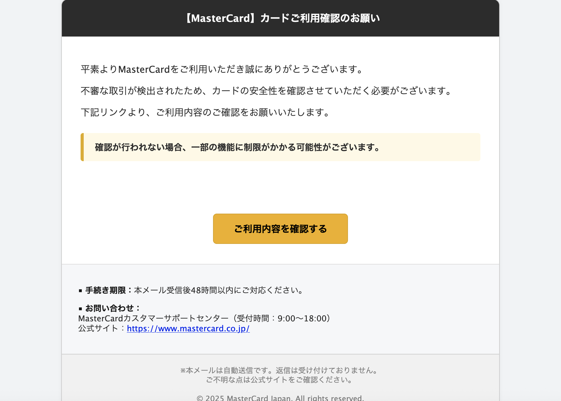 2026年 1月 7日にマスターカードを騙る詐欺メールが学内のメールアドレスに送信されてきていることを確認しました。サンプルとして一部を示します。