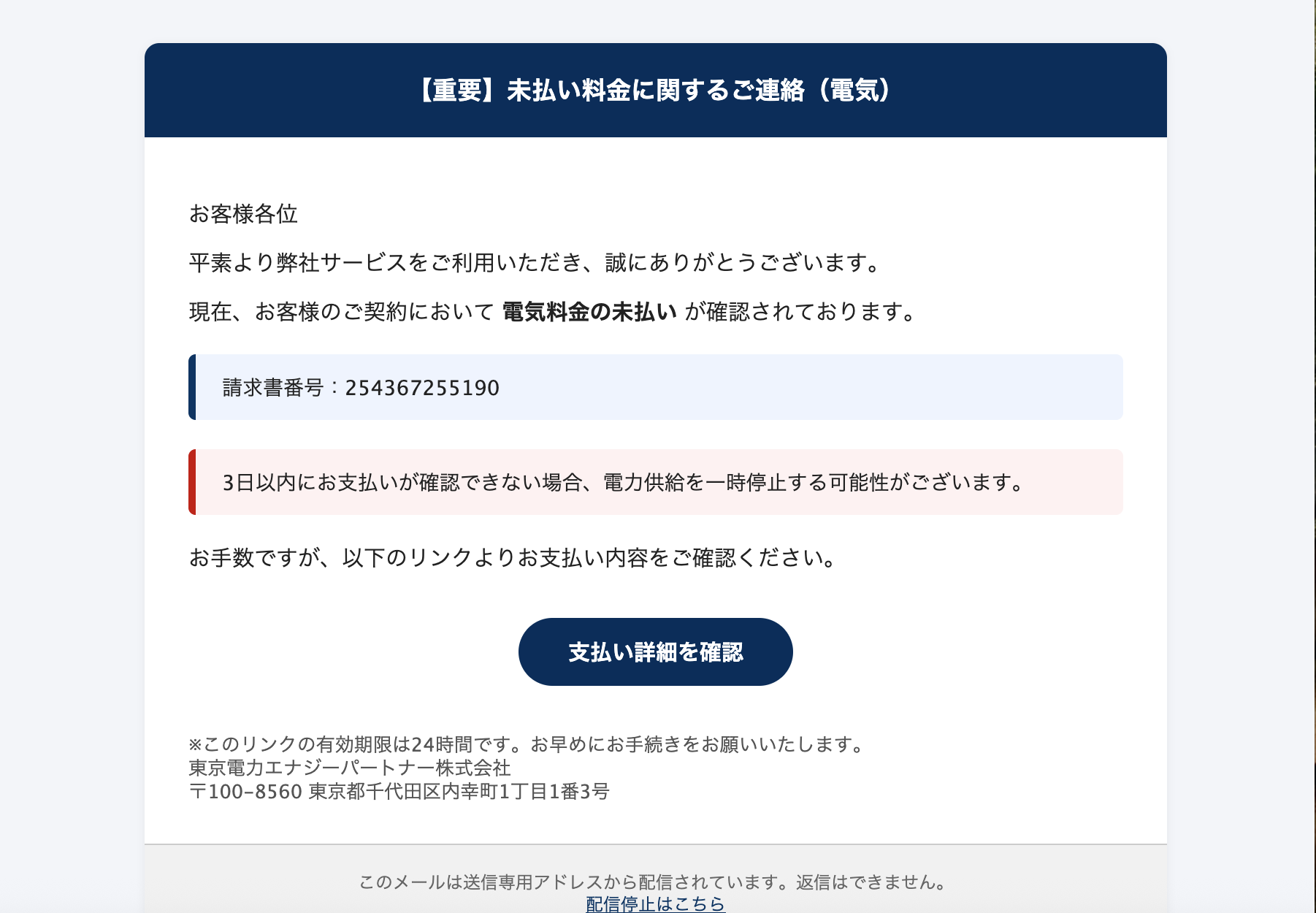 From: 東京電力エナジーパートナー <yasumotokenta1984@rvais.com>リンク先は詐欺サイトが動作しています。
