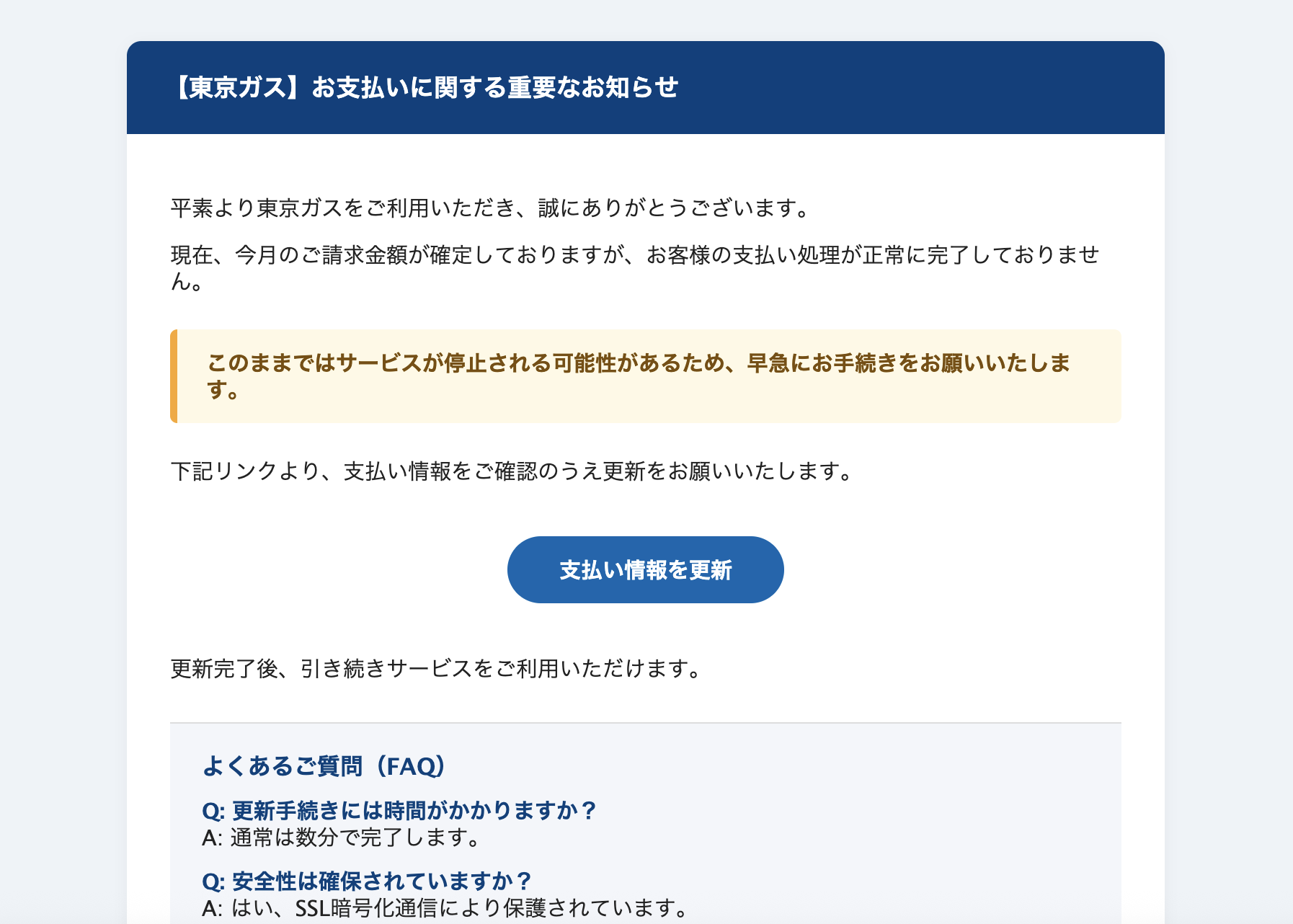 2026年 1月 7日に東京ガスを騙る詐欺メールが学内のメールアドレスに送信されてきていることを確認しました。サンプルとして一部を示します。