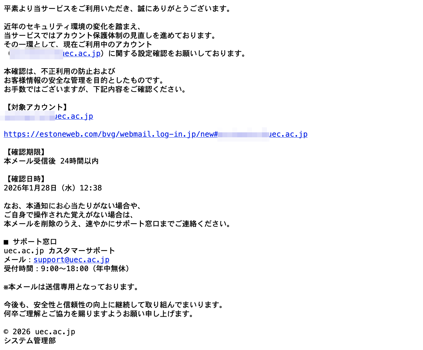 From: "uec.ac.jp"<postmaster@uec.ac.jp>リンク先は詐欺サイトが動作しています。