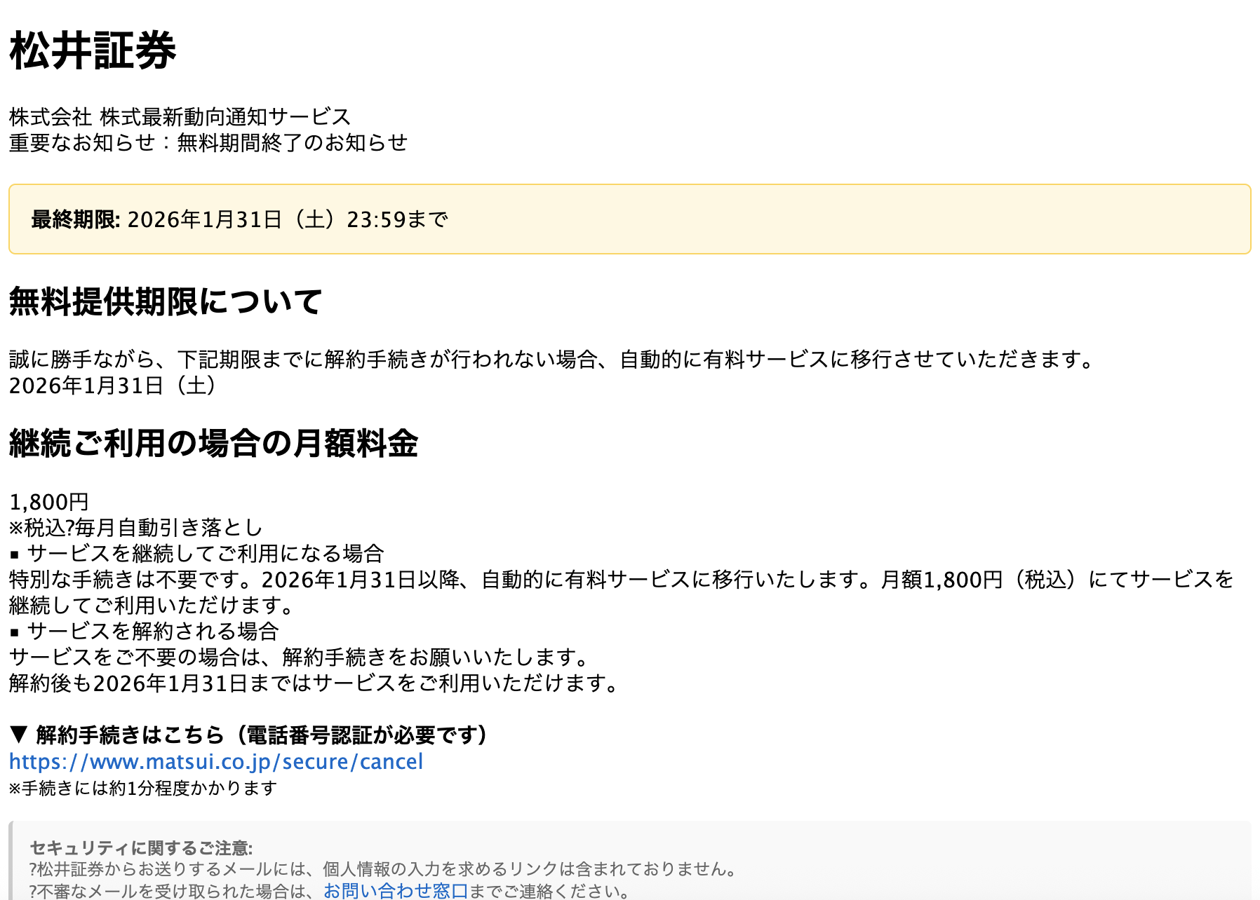 Subject: 重要なお知らせ:無料期間終了のお知らせ