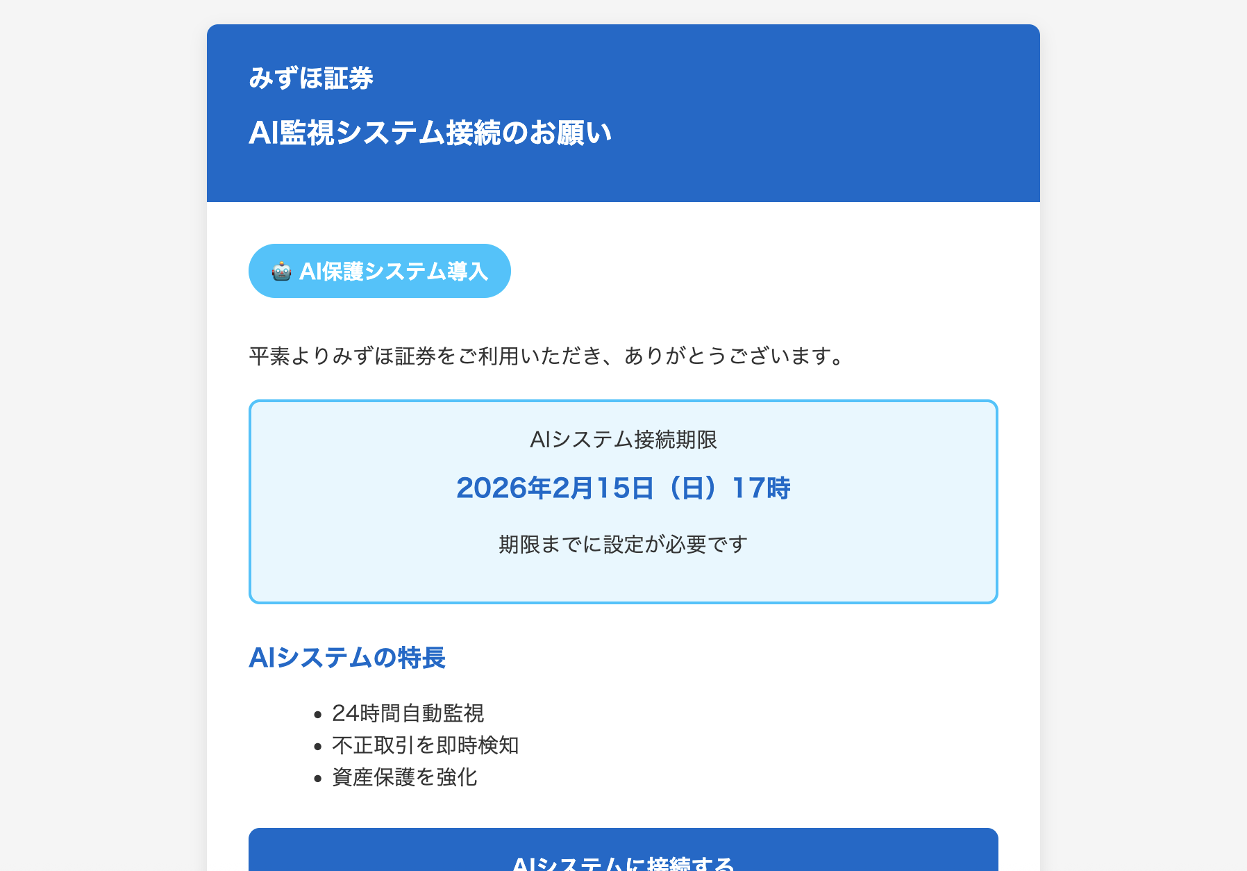 Subject: 【重要】みずほ証券:不正取引リスクから資産を守るため、AI監視システムの接続を開始してください