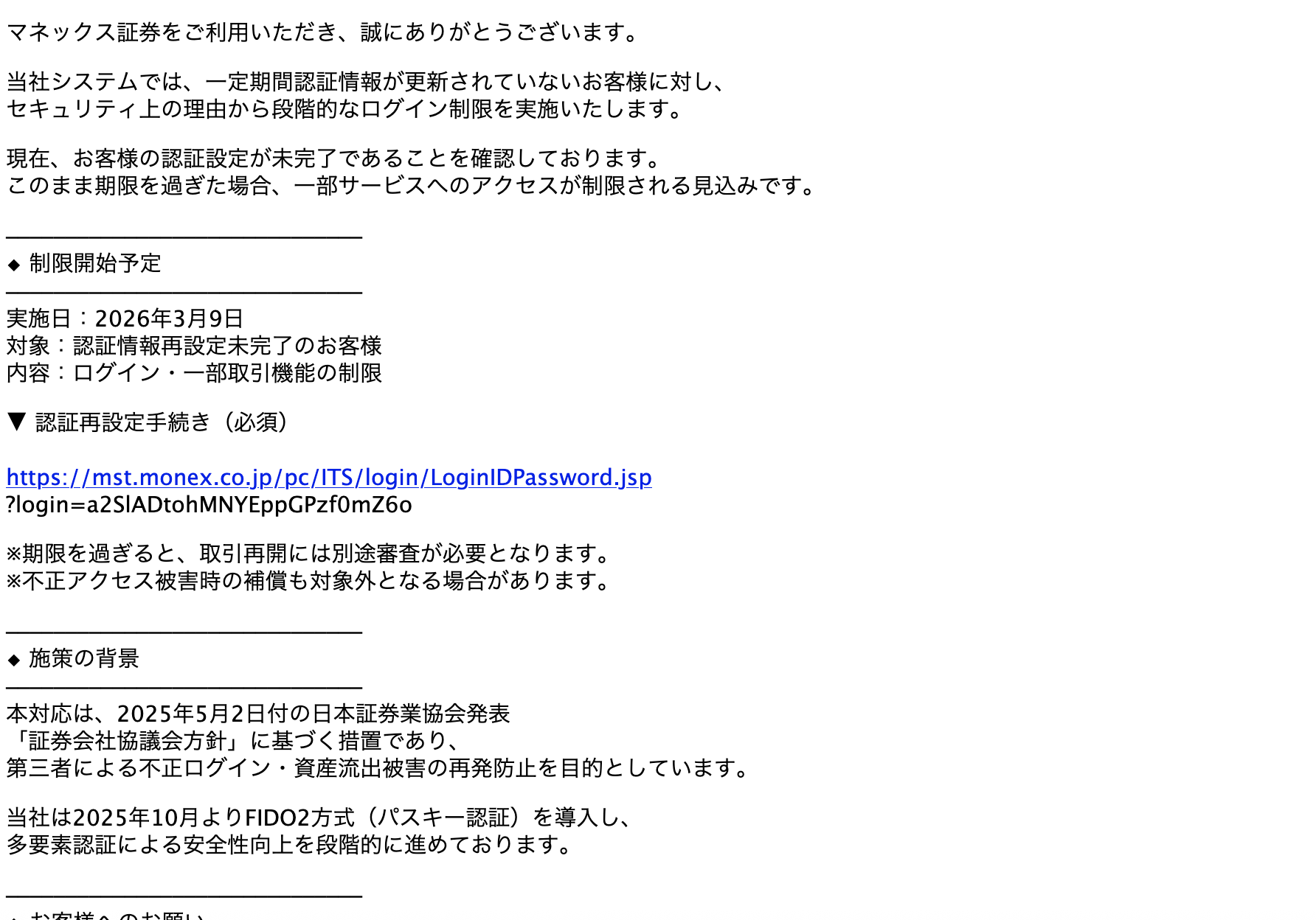 2026年 3月 9日にマネックス証券を騙る詐欺メールが学内のメールアドレスに送信されてきていることを確認しました。サンプルとして一部を示します。