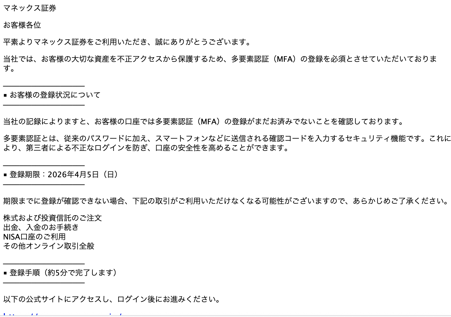 2026年 3月 9日にマネックス証券を騙る詐欺メールが学内のメールアドレスに送信されてきていることを確認しました。サンプルとして一部を示します。
