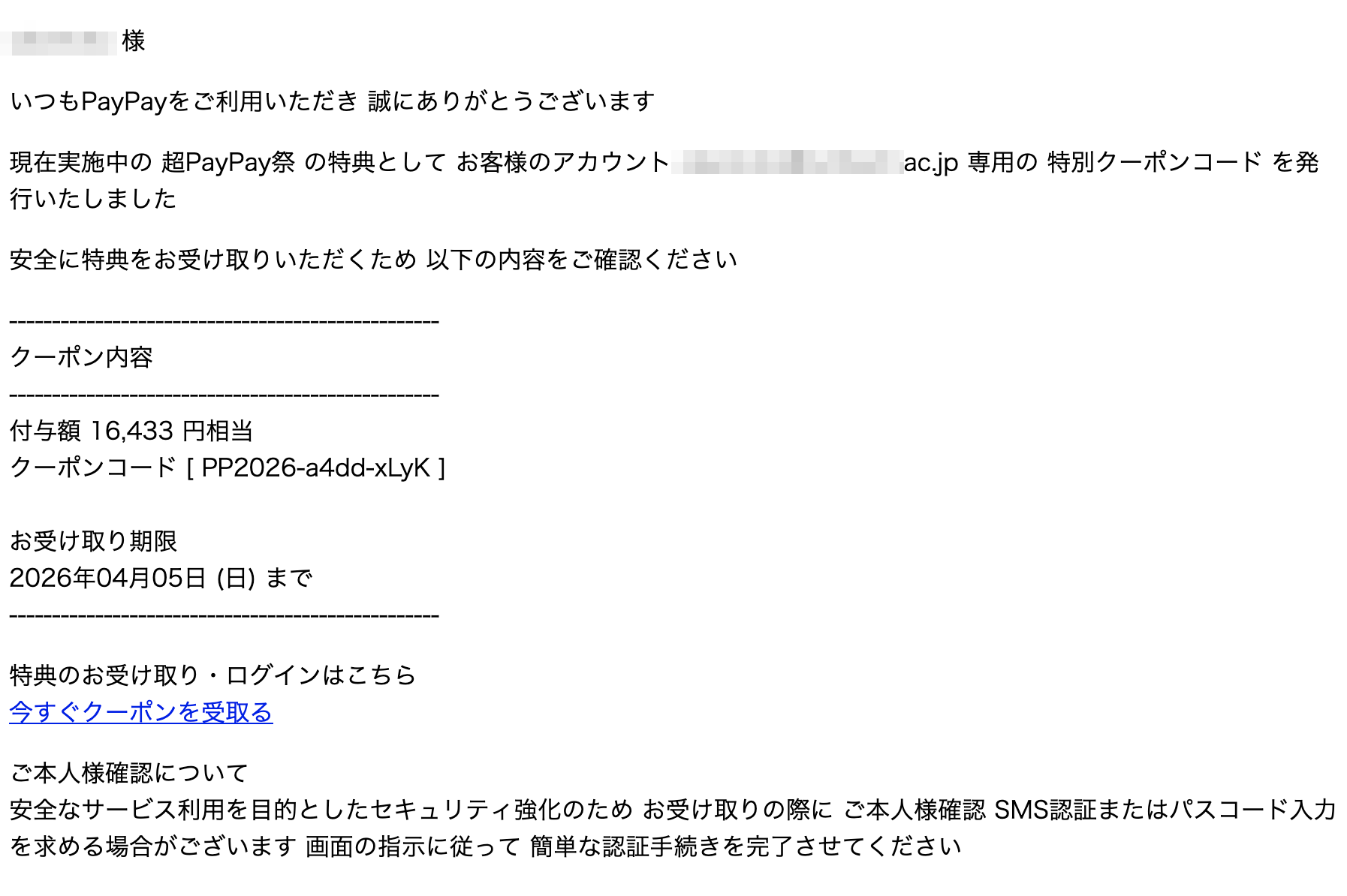 2026年 4月 2日にPayPayを騙る詐欺メールが学内のメールアドレスに送信されてきていることを確認しました。サンプルとして一部を示します。